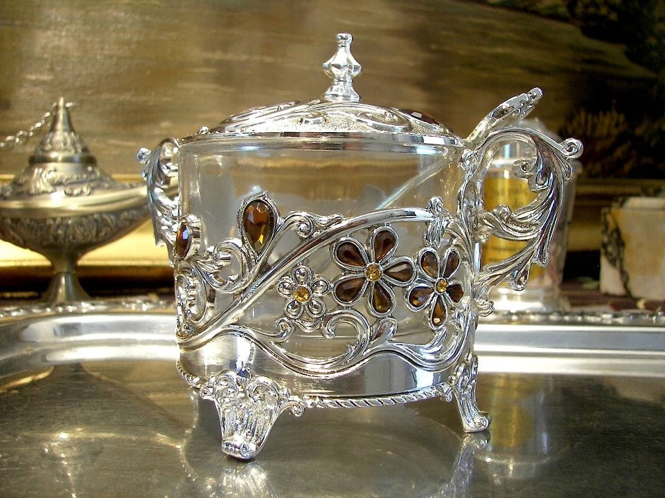 ЦУКЕРНИЦЯ ПОСРІБЛЕНА, ІМІТАЦІЯ БУРШТИНУ, КВІТКОВІ ВЗЕРУНКИ, СИМУДНИЙ ПОДАРУНОК