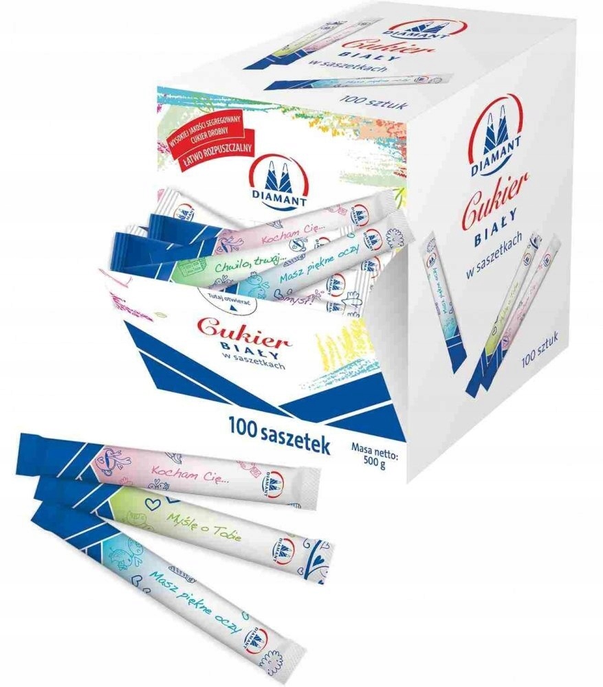 - один пакетик — це одна порція цукру, ідеально підходить для підсолоджування гарячих напоїв, напр. кава або чай