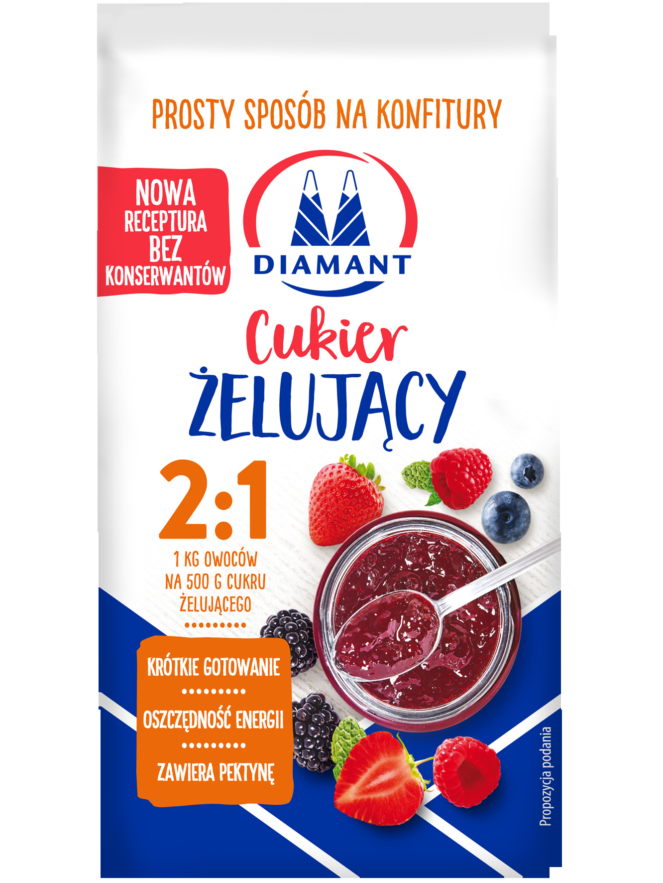 Діамант Цукор желюючий 2:1 - продукт, призначений для приготування джемів. На кілограм фруктів використовуємо 0,5 кг желюючого цукру DIAMANT 2:1. Ідеально підходить для варення з дуже солодких фруктів, а також заморожених. Рекомендується для варення, приготованого в мікрохвильовій печі. Товар упакований в паперові пакети по 500 г.