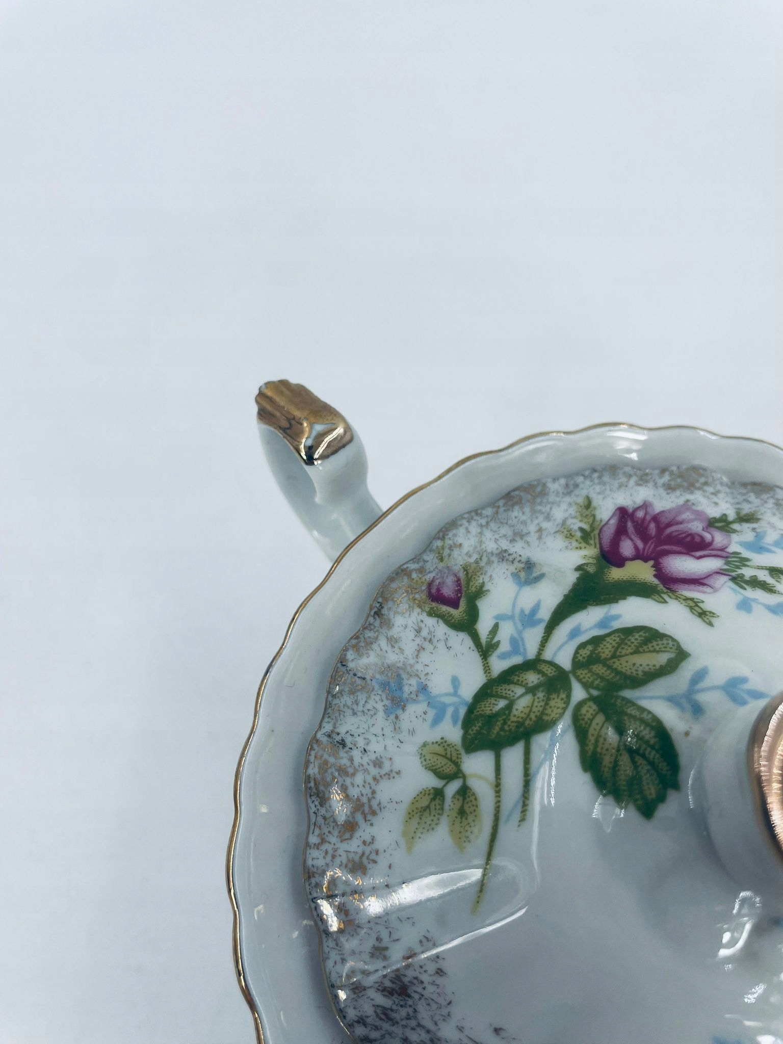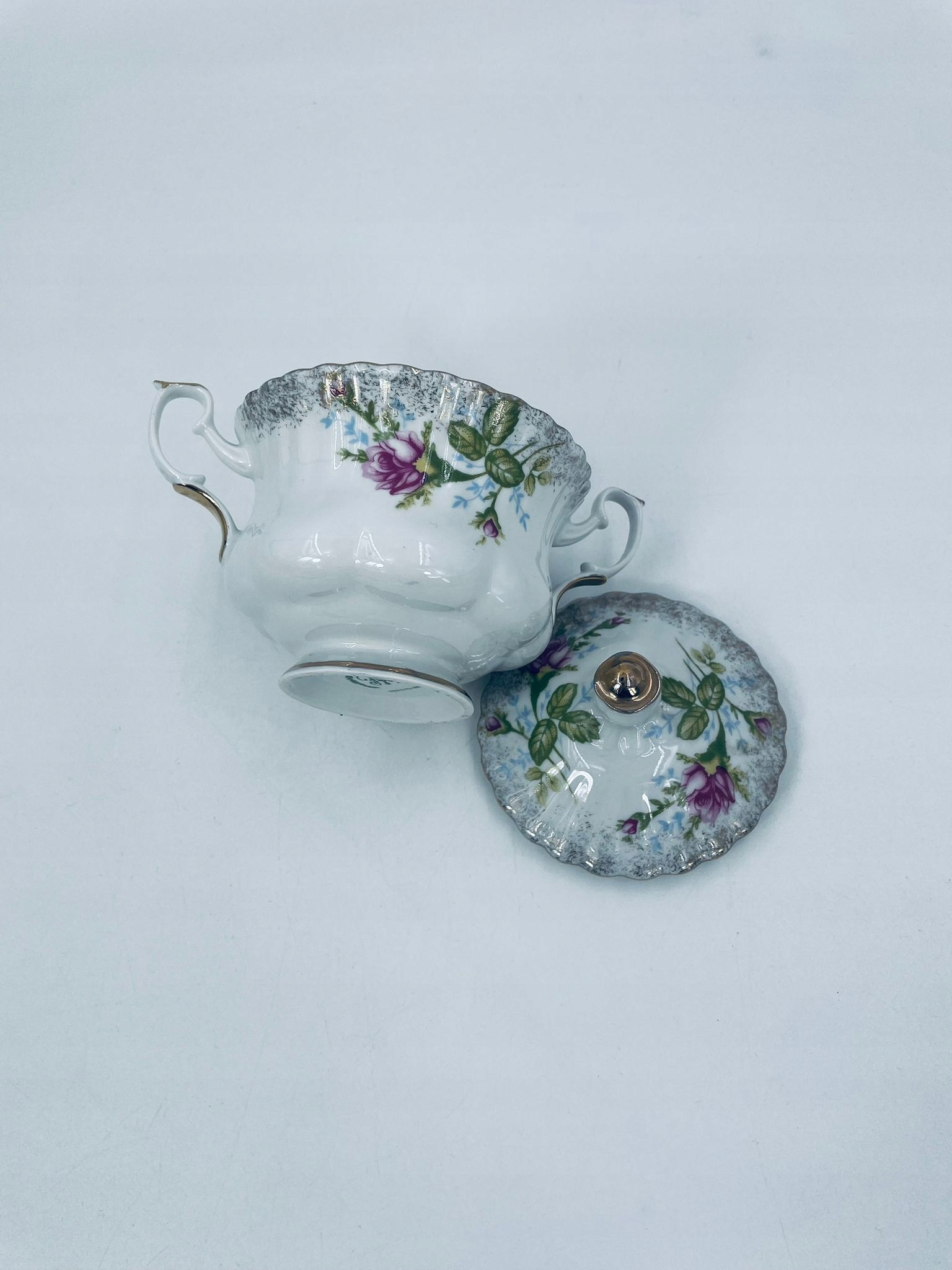 Цукорниця з двома ручками польської порцелянової фабрики Ходзеж, стиль Iwona gold rose. Високоякісна біла порцелянова цукорниця з характерним, стильним декором красивих бордових троянд із зеленими гілками. Виріб багато декоровано та оздоблено позолотою. Має незначні потертості на позолоті на двох ручках.