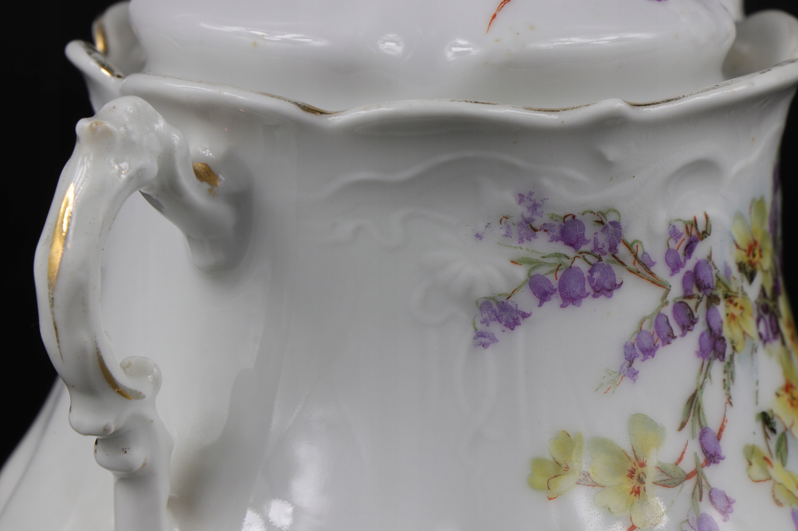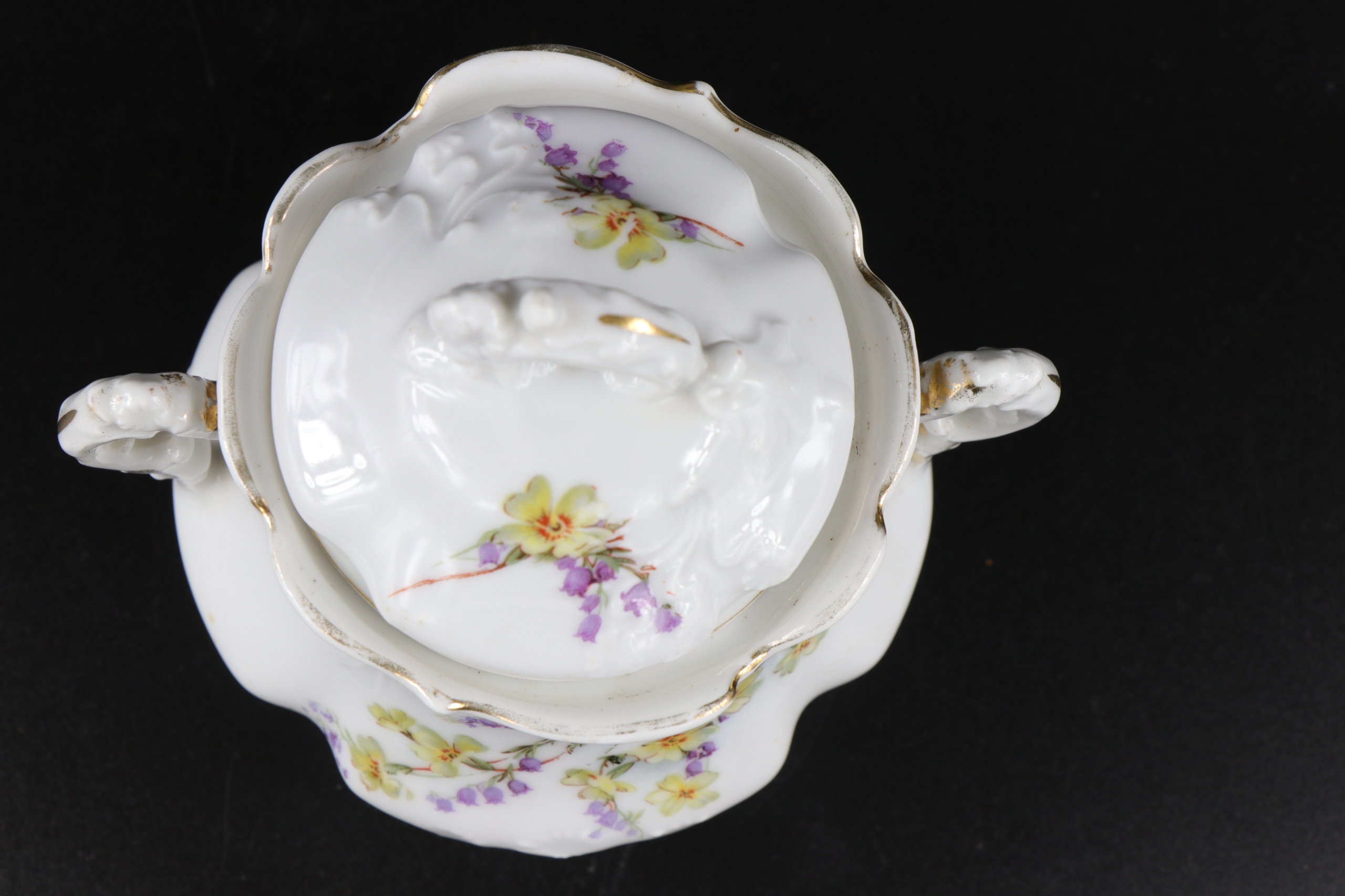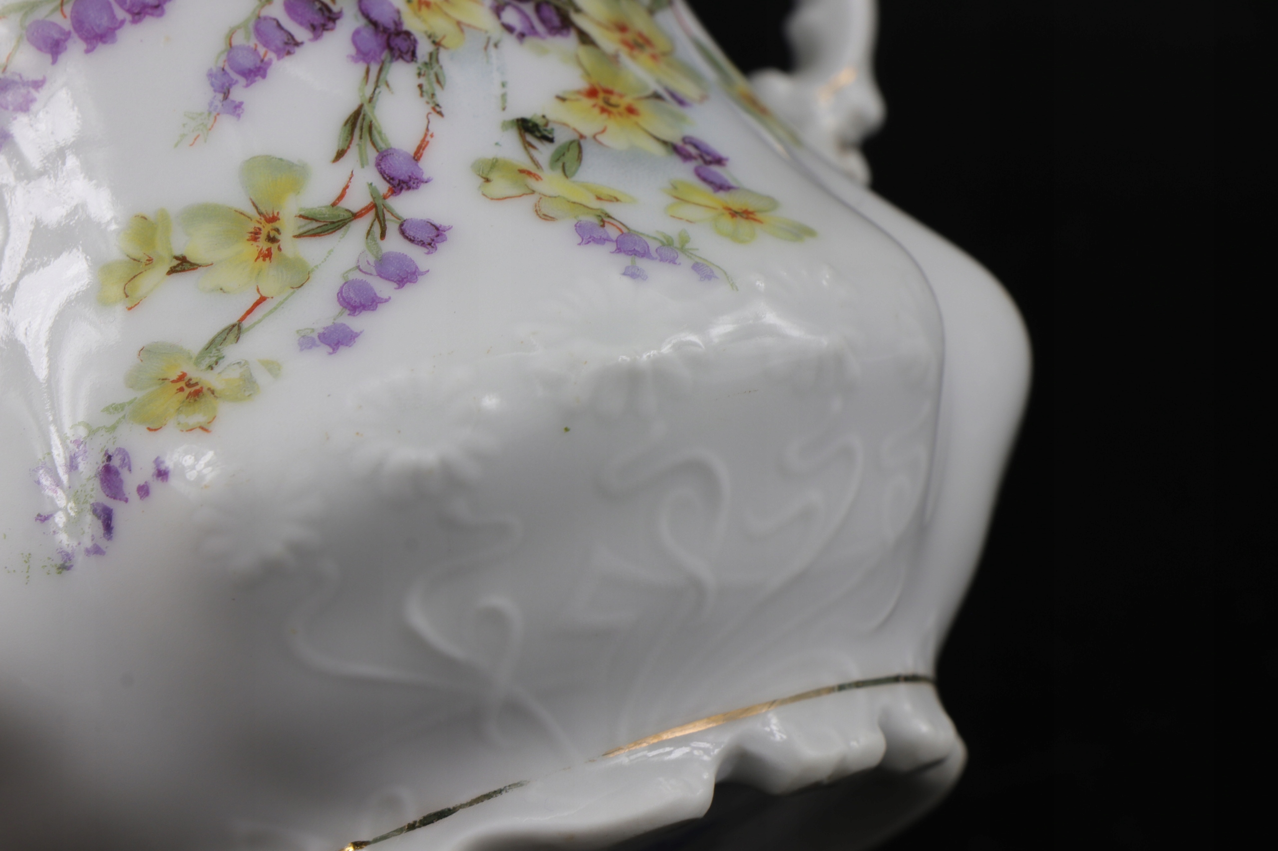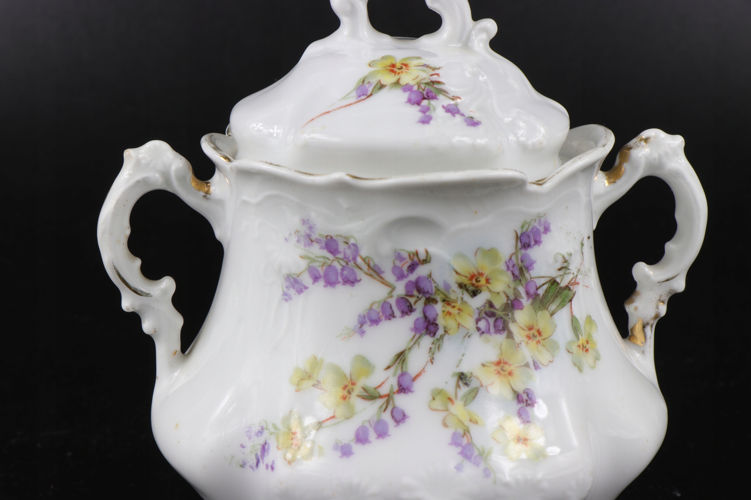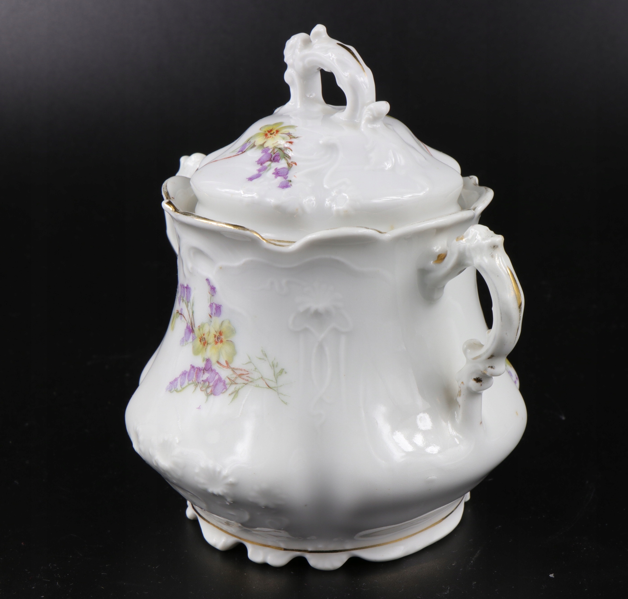 порцелянова цукорниця роботи Жари Сорау приблизно 1900 року. Декорування порцеляни красивим рельєфом у стилі модерн та орнаментом із квітів, виконаним за допомогою кальки.