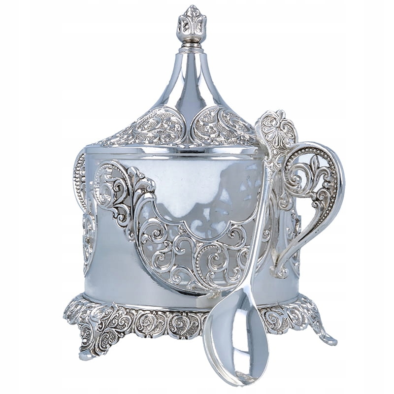 Призначена для людей, які люблять оточувати себе красивими предметами. Наша модель виготовлена з високоякісного металу сріблястого кольору, поверхня захищена гальванічним покриттям, що підвищує її довговічність і стійкість. Цукорниця красиво прикрашена тисненими візерунками, які чудово відчуваються під кінчиками пальців. Поверхня має високий глянець, за винятком декорацій, деякі з яких злегка матові. Міцна широка основа з трьома ніжками забезпечує стійкість. Боковина частково покрита металевим кожухом, частина кожуха сформована в ажур. Всередині скляна цукрова вставка знімається, тому ви можете легко підтримувати її в чистоті. У набір входить декорована кришка з міцною ручкою та маленька ложка.