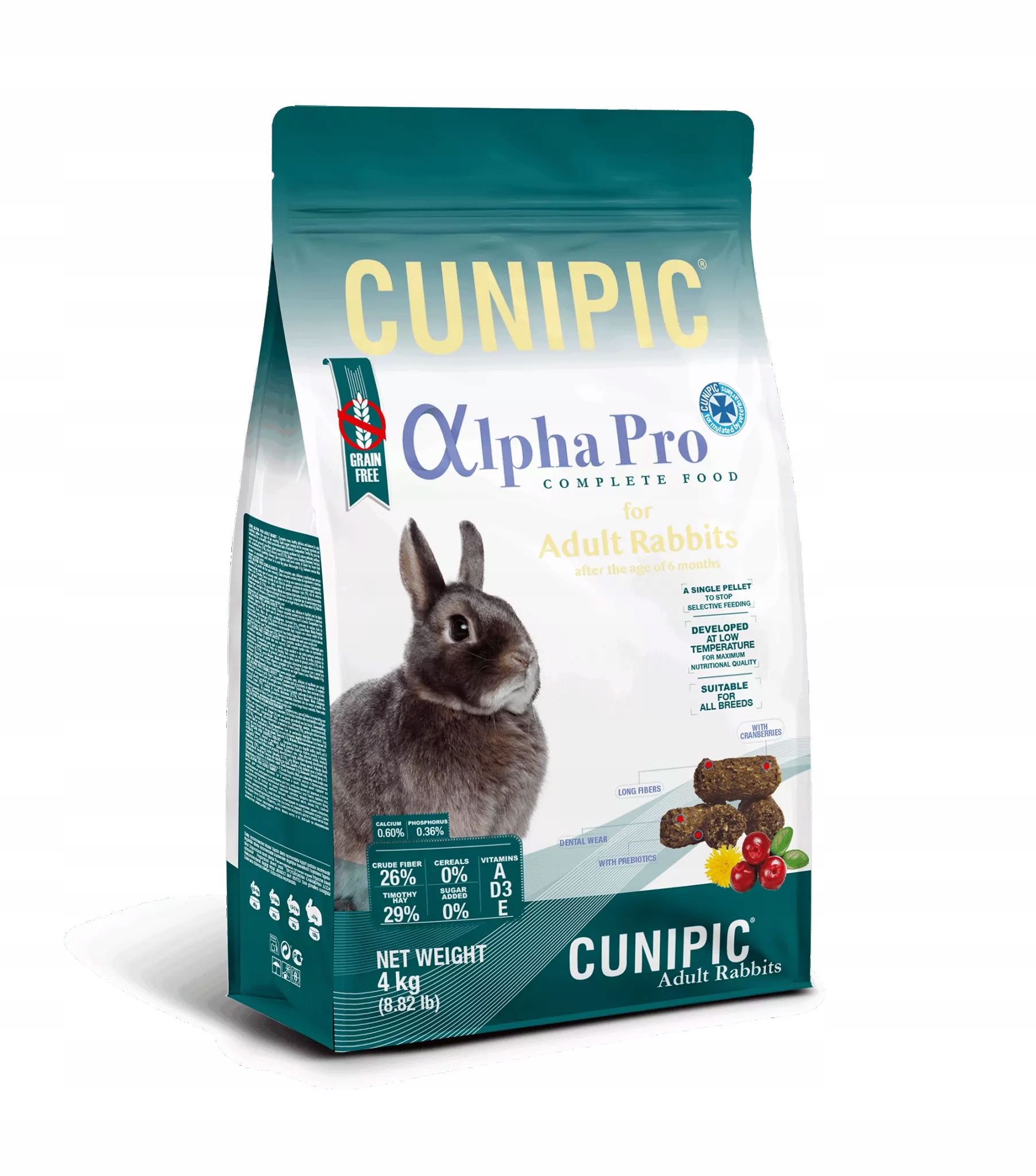 Cunipic Alpha Pro — це перший екструдований беззерновий корм для кроликів, що робить його чудовим вибором для тварин із чутливою системою травлення. Оптимальне співвідношення кальцію та фосфору допомагає підтримувати здоров’я нирок, а додавання пребіотиків підтримує мікрофлору кишечника та запобігає діареї.