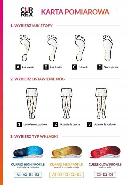 Модель Hike Pro – лише один із продуктів у широкому асортименті німецького бренду Currex – лідера серед виробників устілок для взуття. Модель Hike Pro, як випливає з назви, призначена для трекінгового, туристичного та гірського взуття. Однак вони ідеально підходять для взуття, яке ми носимо щодня. Бігові устілки, завдяки своїй унікальній анатомічній формі та 3 різним типам залежно від типу стопи, дозволяють кросівкам краще прилягати до стопи. Це забезпечує максимальний комфорт і зручність, а також стабільність. Ергономічна форма, особливо в області п'яти, дозволяє дуже добре підходити до форми стопи. Ви відчуєте різницю вперше, коли одягнете його! Крім того, вставки в черевики ідеально поглинають удари та удари, викликані ударами об землю. Це підвищує захист суглобів і м'язів від травм і підвищує комфорт, особливо під час походів з важким рюкзаком. Використані матеріали і форма устілки перешкоджають руху стопи у взутті і відводять вологу, що значно знижує ризик появи мозолів, потертостей і виразок. Це дуже важливо, особливо при використанні важкого, добре складеного трекінгового взуття. Спеціальна конструкція, посилена в середній частині стопи, забезпечує динамічну підтримку підошовної фасції та склепіння стопи під час ходьби, що забезпечує комфорт і знижує стомлюваність. Устілки Currex Hike Pro виготовлені з матеріалу, ідеально збалансованого за показниками еластичності та м'якості. Це гарантує комфорт, навіть під час цілоденних походів по складній і складній місцевості. У цій моделі є технологія Super Grip, яка не дає стопі рухатися у взутті - це особливо важливо при спуску, тим більше при носінні важкого рюкзака. Щоб правильно підібрати устілки, дивіться малюнок нижче.