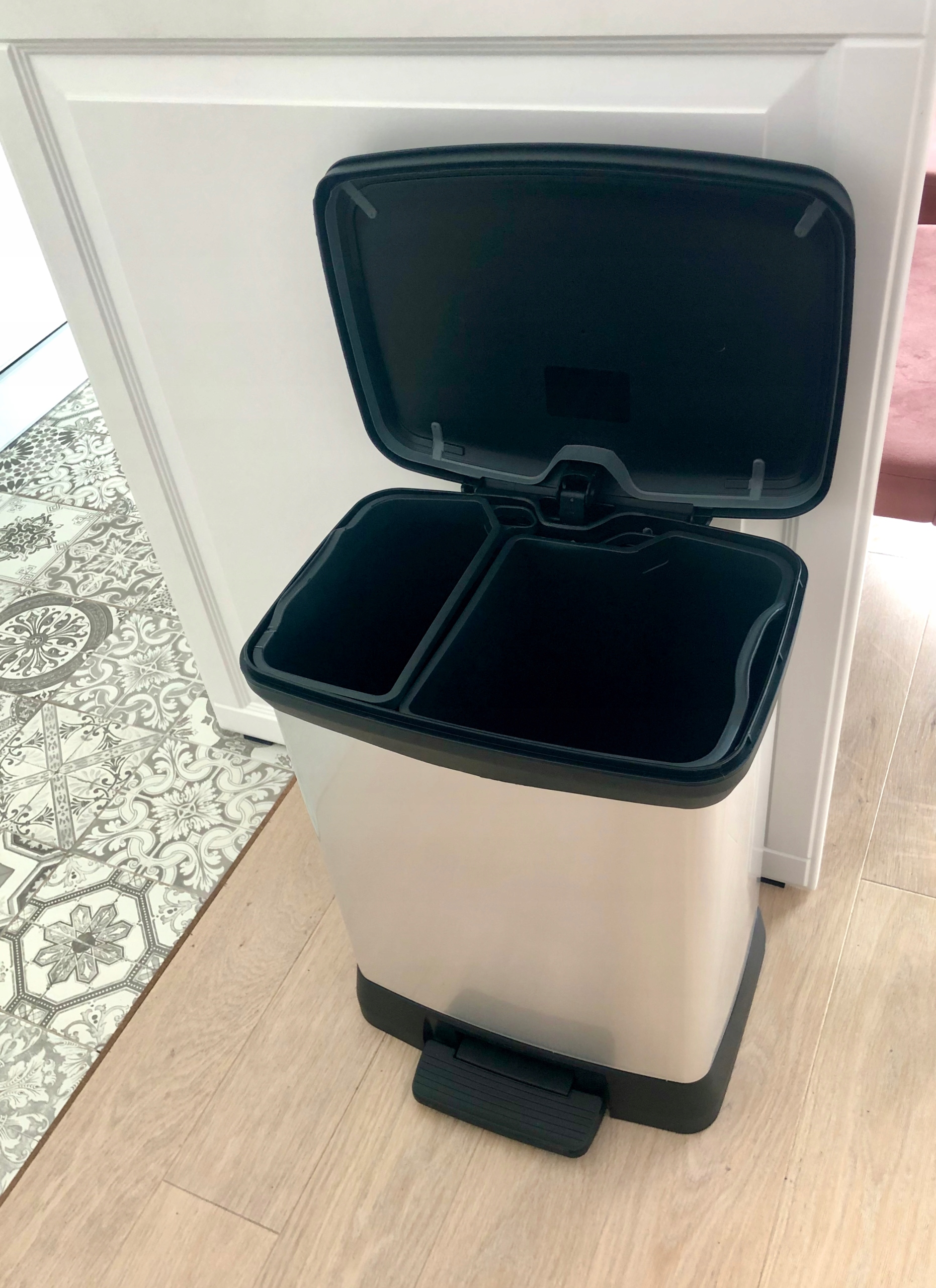Кошик має два внутрішніх відра ємністю 10 і 18 літрів, ідеально підходить для розділення сміття на кухні чи в офісі.
