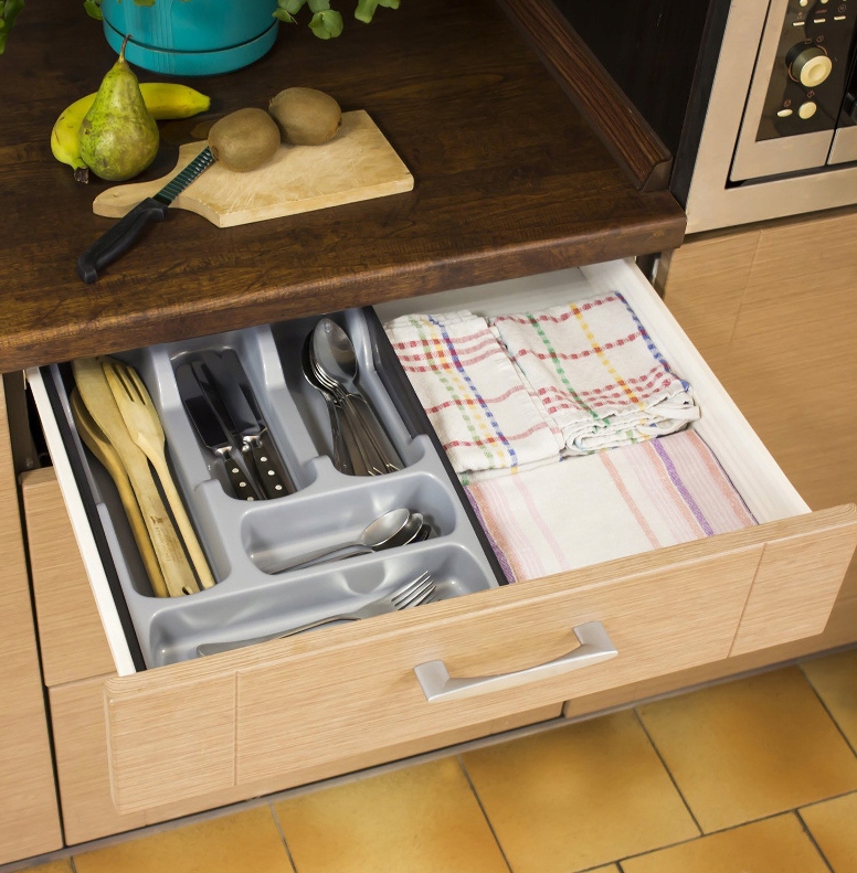 Ця геніальна вставка дозволяє легко підтримувати порядок у вашій кухонній шухляді; розділяє ложки, чайні ложки, виделки та ножі.