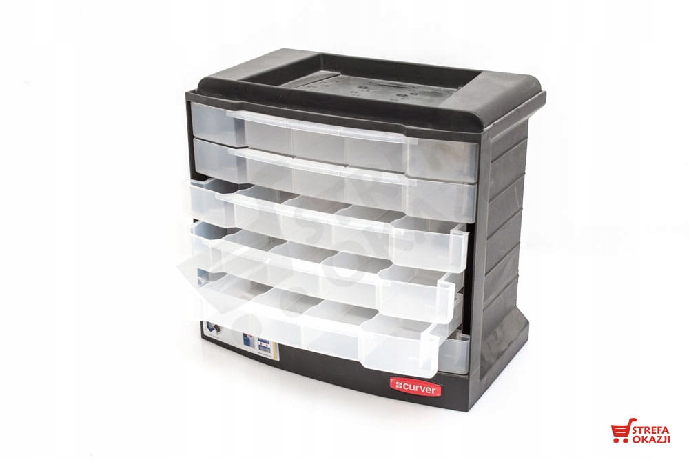 Суцільна коробка з висувними ящиками для різних застосувань. 6 ящиків, кожен розділений на 5 відділень, 2 з яких розділені навпіл. Крім того, цю коробку можна скласти одна на одну, якщо вам потрібно більше місця для дрібних речей.
