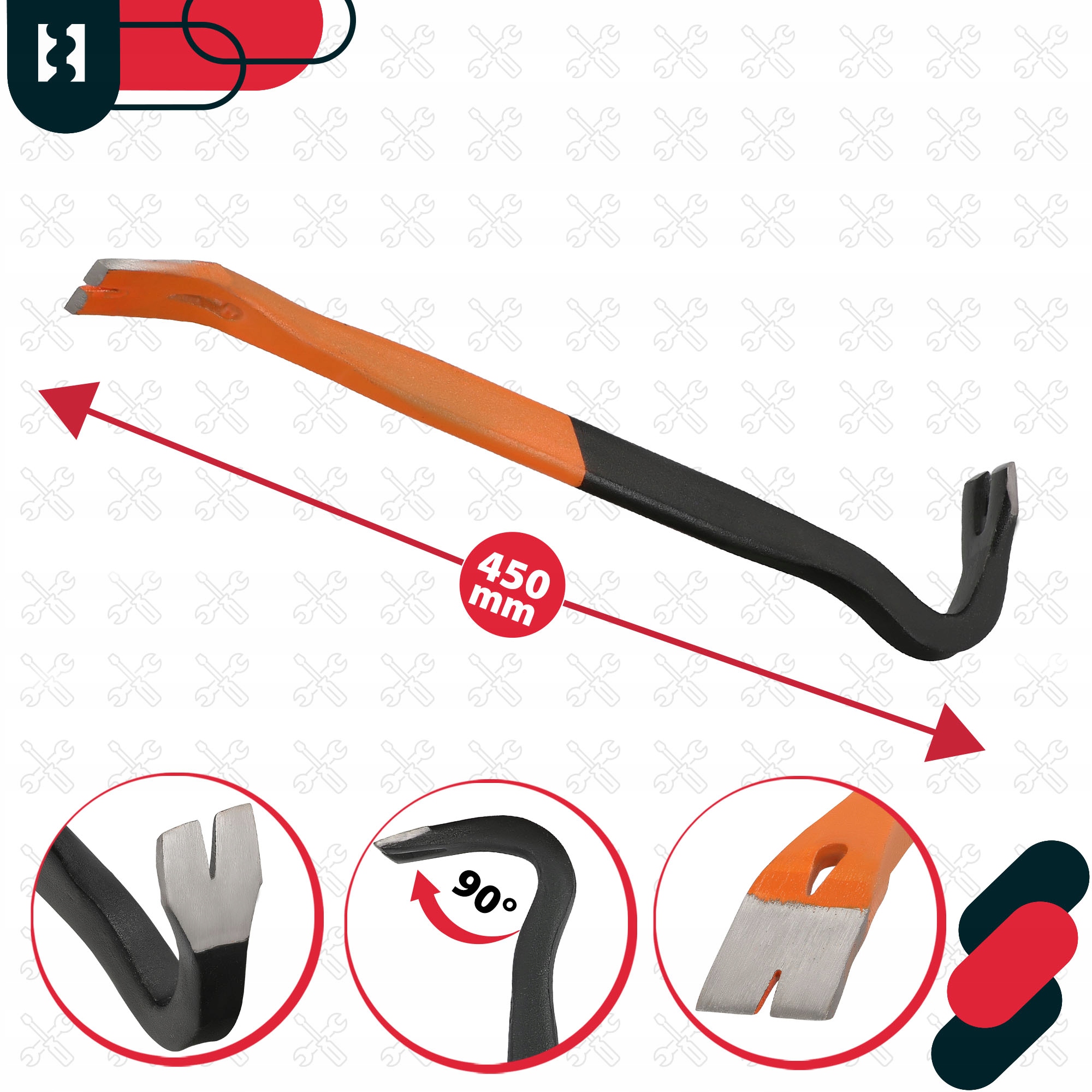 Будівельний лом KOTARBAU є універсальним інструментом, який підходить для різноманітних будівельних і ремонтних робіт. Оснащений прорізами з обох сторін, він ідеально підходить для витягування навіть найважчих цвяхів, що можливо завдяки загнутому під кутом 90 градусів кінчику. Інший кінець ригеля сплющений і злегка зігнутий, що дозволяє зручно знімати дошки, полегшуючи демонтаж підлоги, смуг або вагонки.