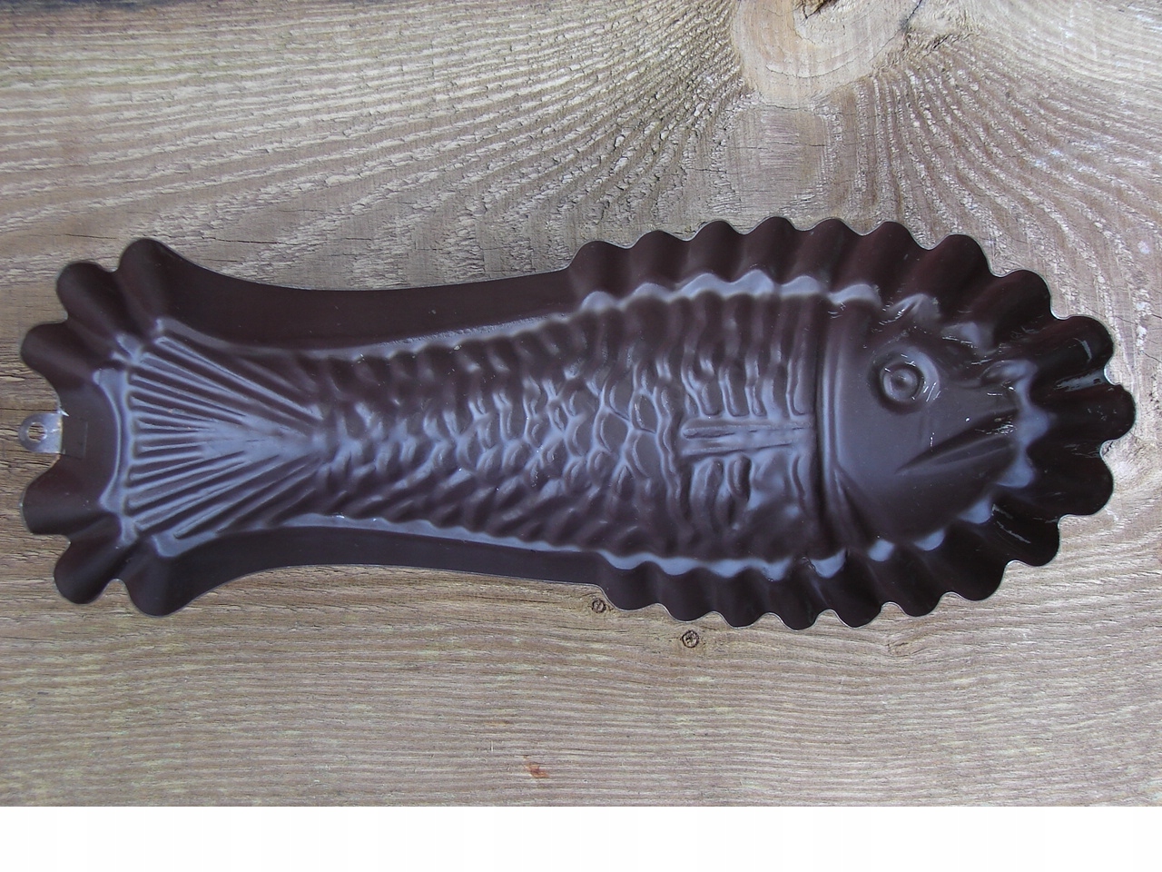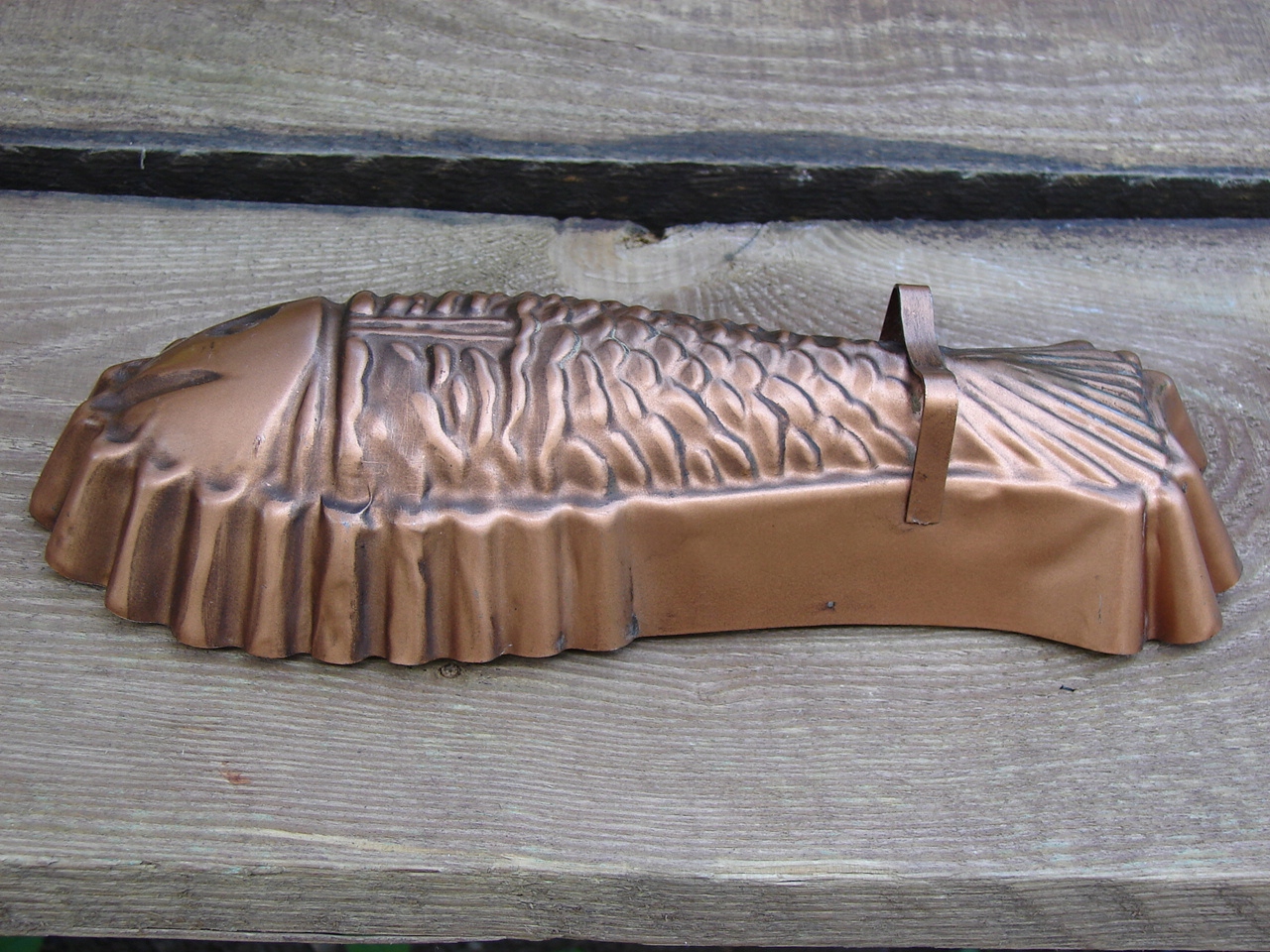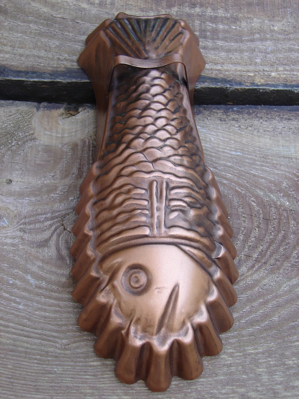 Виготовлена з металу форма у формі риби, з поверхнею мідного кольору.