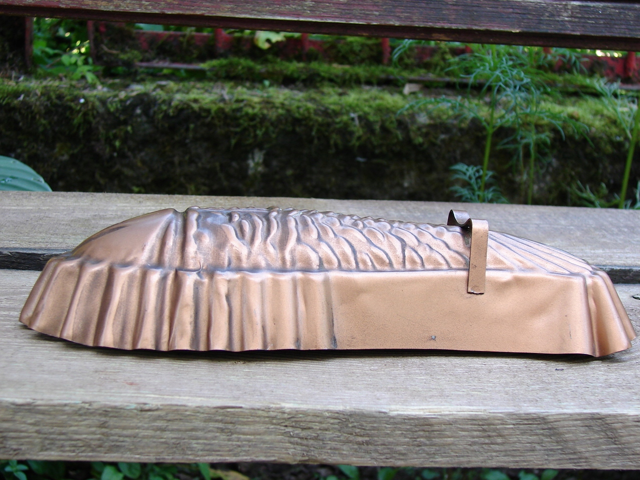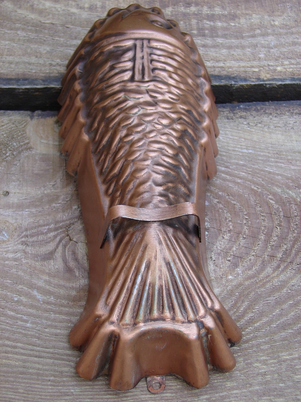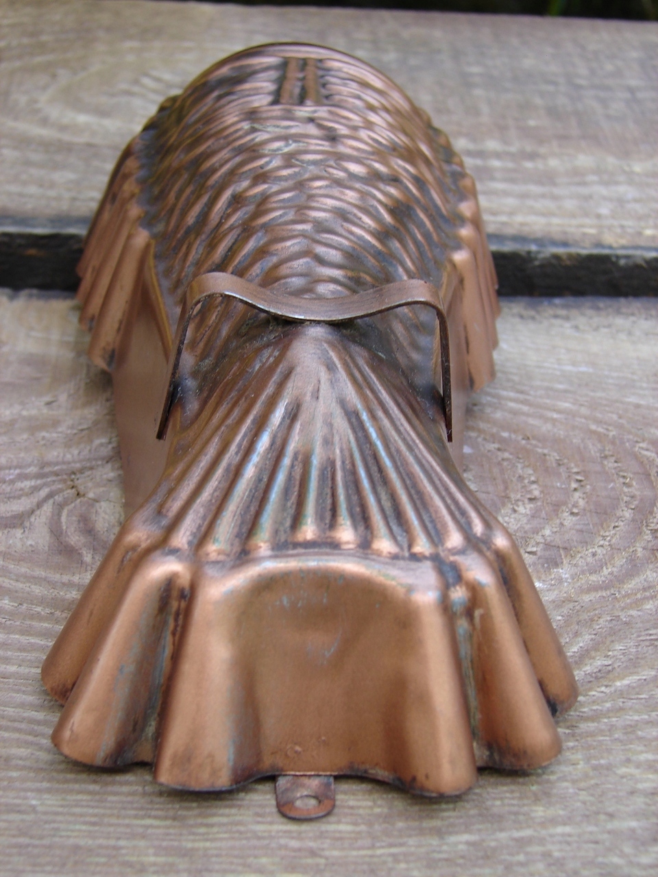 Виготовлена з металу форма у формі риби, з поверхнею мідного кольору.