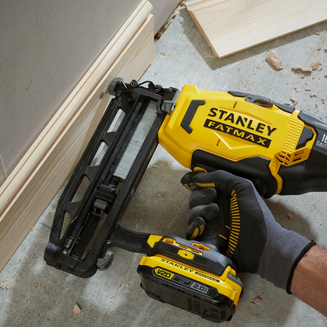 Акумуляторний цвяхозбійник (цвяхозабійник) Li-Ion 18V Stanley FATMAX V20 модель SFMCN616D2K. Призначений для фінішних робіт і робіт з клейовими цвяхами 1,6 мм (16Ga), розташованими під кутом 90°. Цвяхозабивна машина має механічний привід, що забезпечує ефективну роботу і підтримує постійні робочі параметри при низьких температурах. Нижчі експлуатаційні витрати порівняно з газом, більша мобільність (немає пневматичних ліній). Цвяхозабивний пристрій Stanley FATMAX дозволяє видаляти застряглі цвяхи без інструментів і без інструментів регулювати глибину забивання. Електроінструмент ідеально підходить, наприклад, для встановлення віконних стовпів, меблів, шаф, панелей, ліпнини та вагонки. Світлодіодне освітлення додатково дозволяє працювати з цвяхозабивачем у місцях з обмеженим доступом світла.