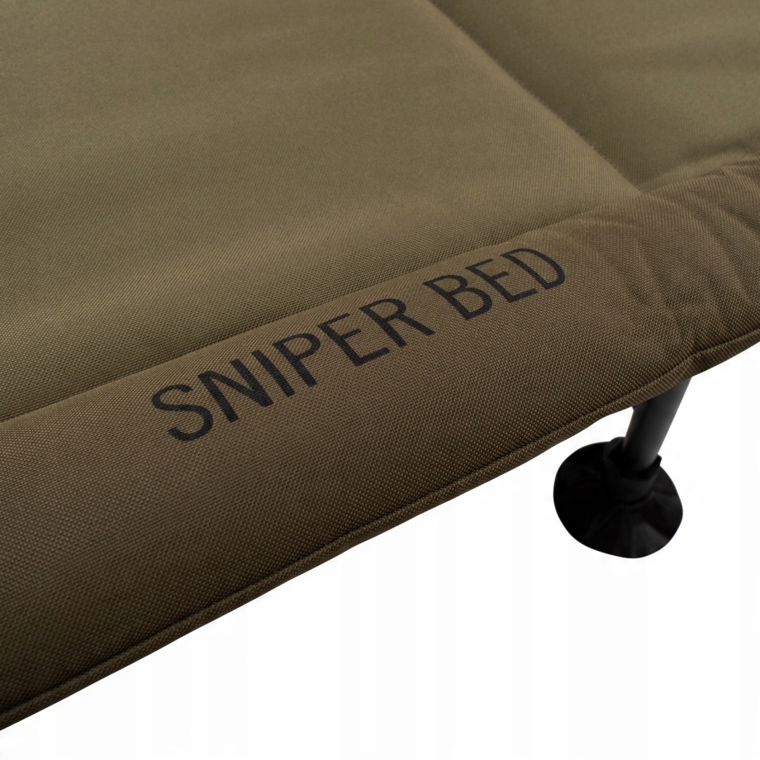 Зручна класична коропова лежанка на п'яти ніжках. Завдяки компактним розмірам дуже легко збирається та розбирається, а також транспортується. Вся конструкція базується на міцній сталевій рамі, встановленій на п'яти регульованих ніжках. Широкі ніжки забезпечують стійке положення на м'якій поверхні. Ліжко Sniper Bed оснащено зручним матрацом із адаптацією до спинки, який забезпечить комфорт під час сну. Жорсткість і прогин матраца можна регулювати за допомогою еластичних натягів, розташованих у нижній частині ліжка. Під час транспортування ліжко кріпиться додатковим ременем, що запобігає небажаному розкладанню та зменшує транспортні габарити. Можливість кріплення будь-якого спальника стандартного розміру.