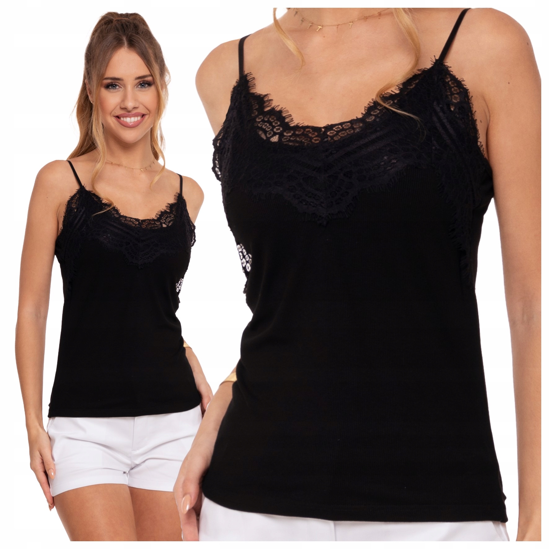 CZARNA KOSZULKA DAMSKA NA RAMIACZKACH TOP PRĄŻKOWANY Z KORONKĄ MORAJ R.S