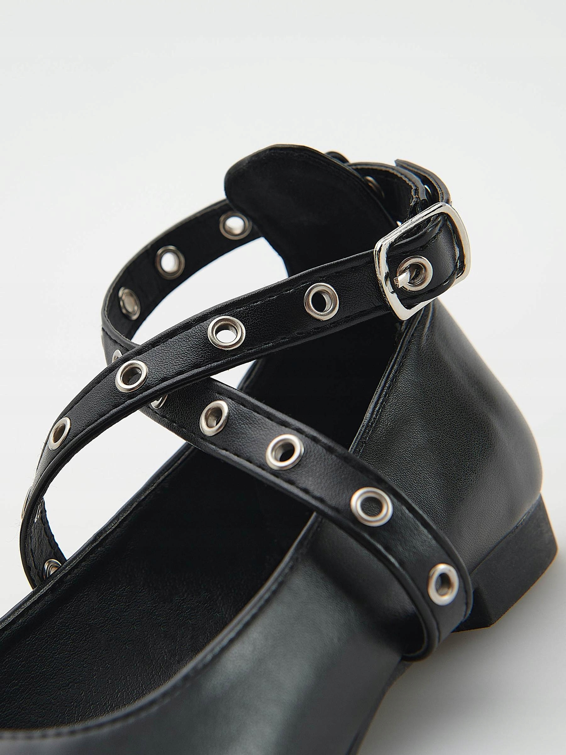 CZARNE KLASYCZNE PŁASKIE BUTY BALERINY Z OZDOBNYMI PASKAMI EKOSKÓRA 35