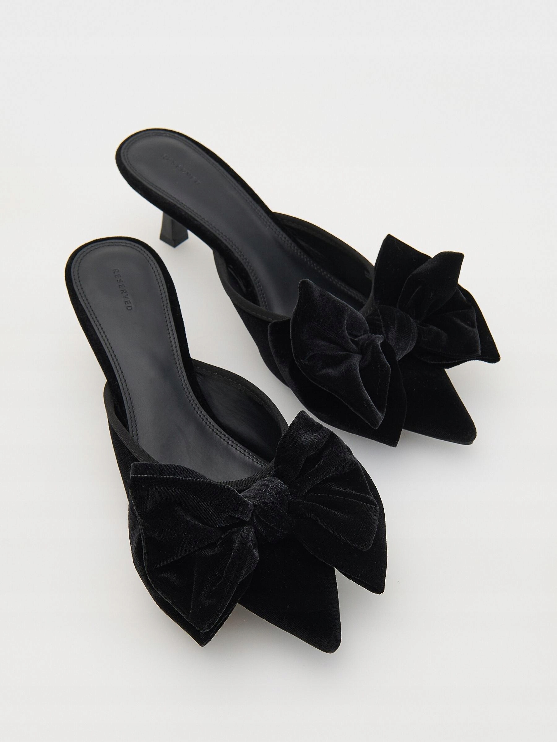 CZARNE ZAMSZOWE KLAPKI OBCAS KACZKA OZDOBNA KOKARDA SZPIC 38