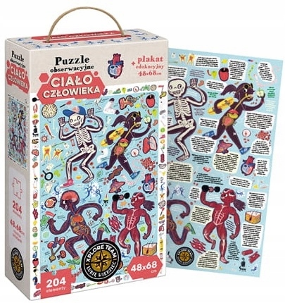 Подивіться, як він побудований і як працює людське тіло. Освітні головоломки 204-елементів гумористичним способом представляють складність людського тіла. На рамці головоломки ми розміщуємо багато деталей для пошуку на ілюстрації, щоб розважальна забава тривала ще довше. Ми додали навчальний плакат до набору.