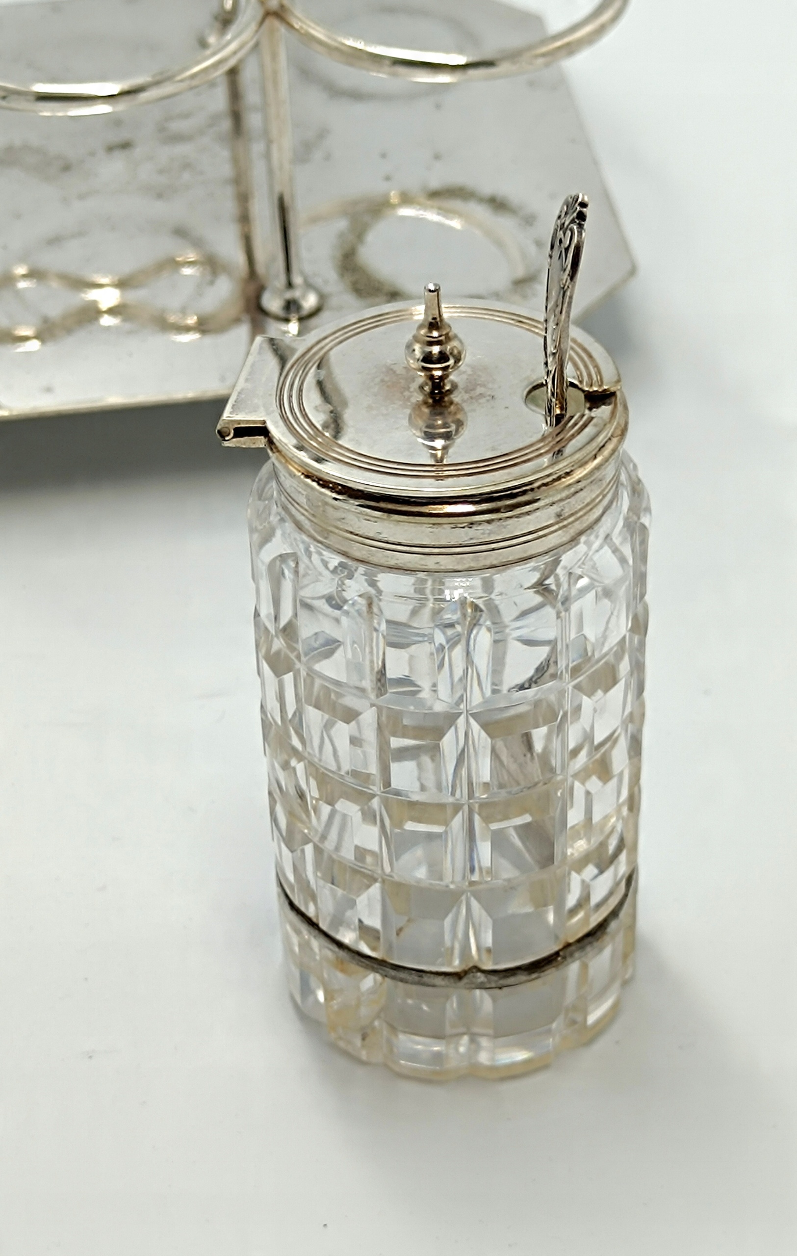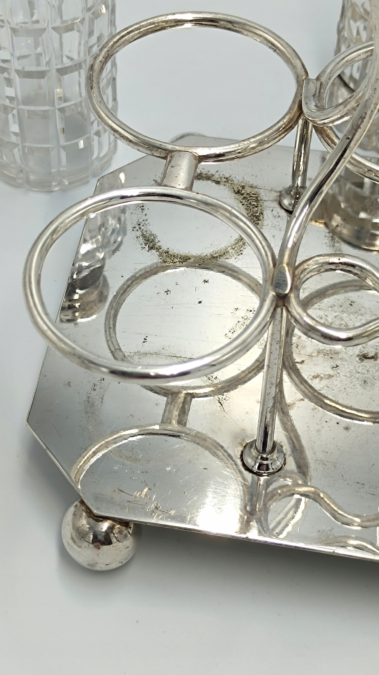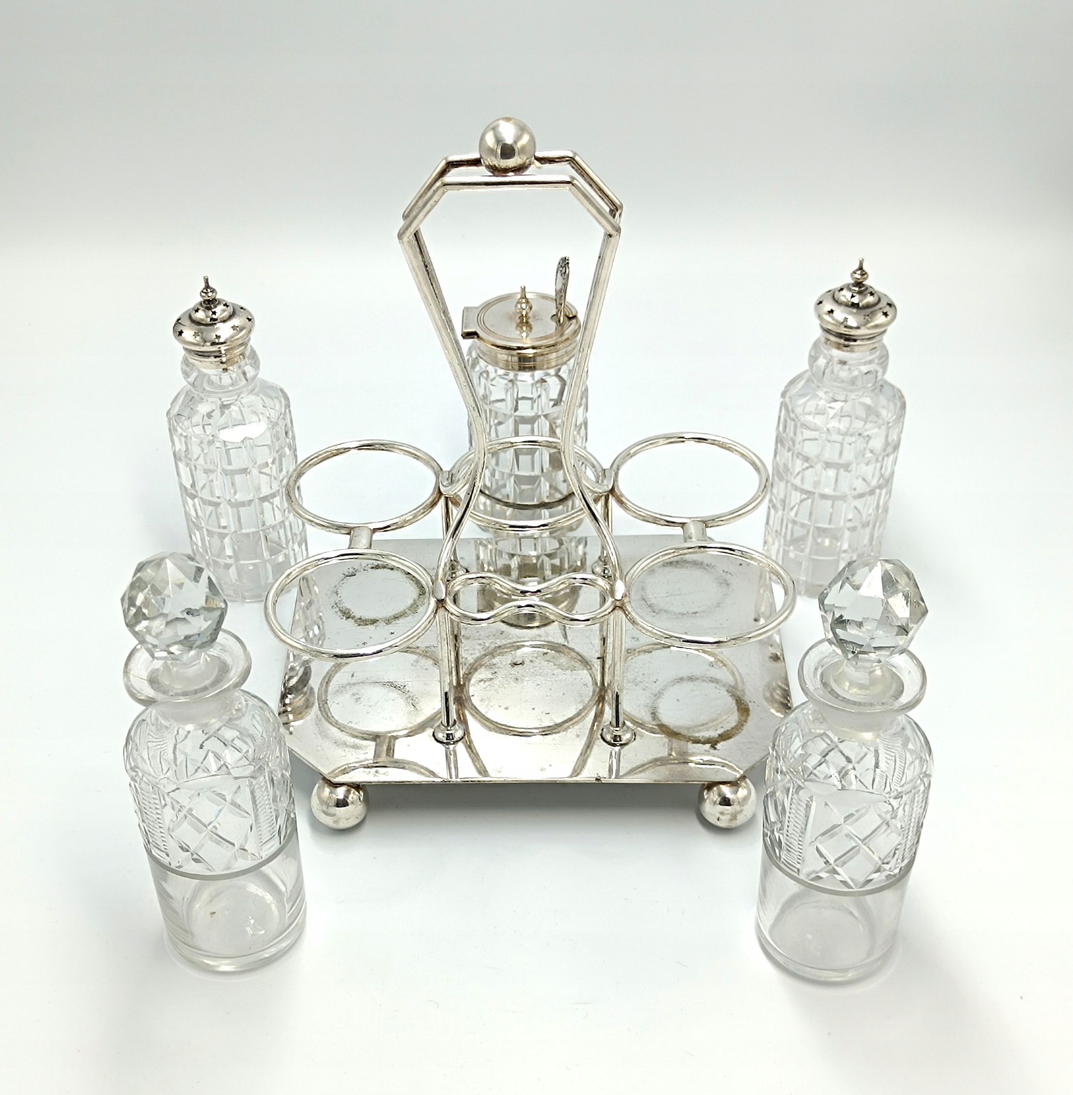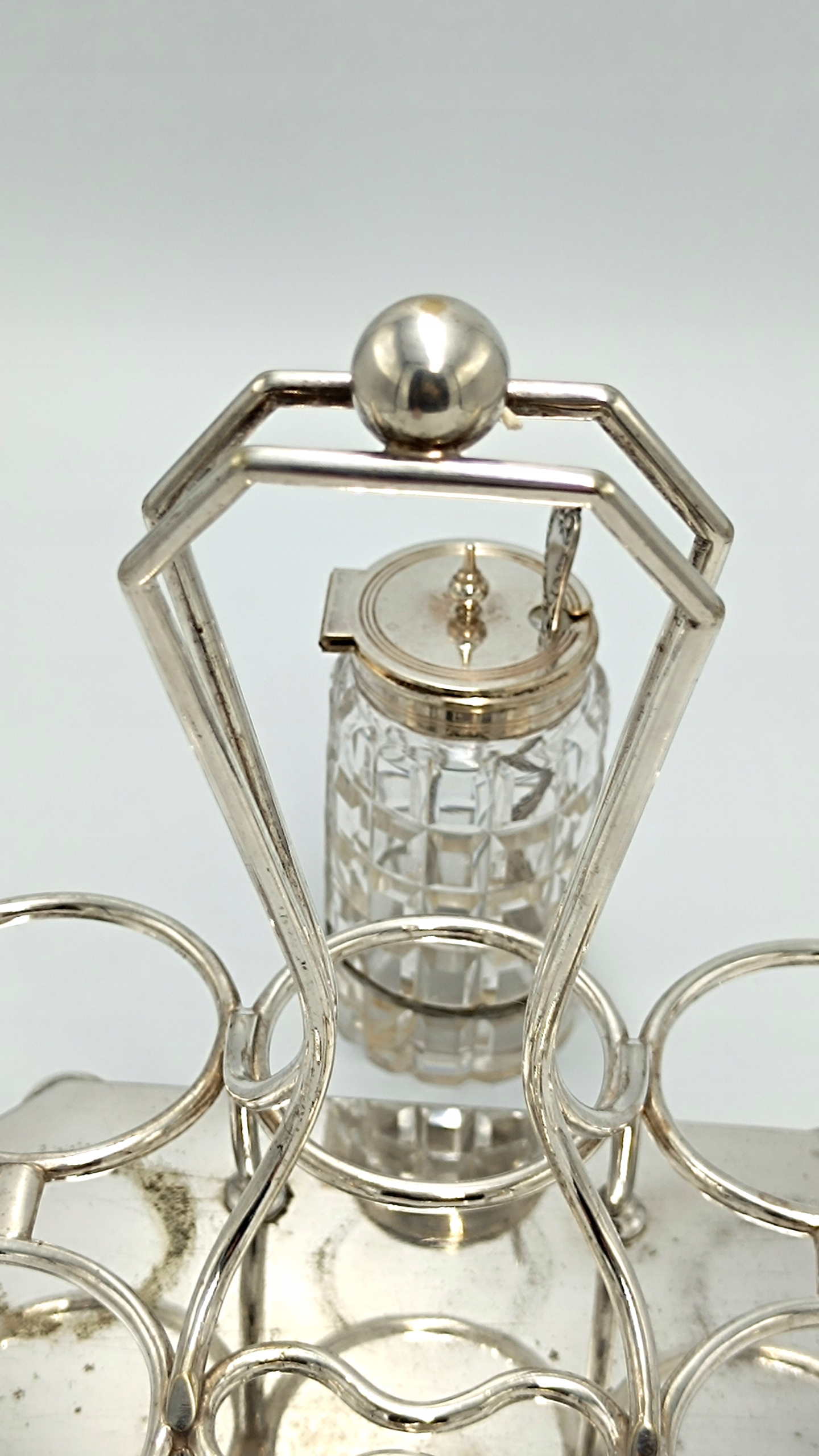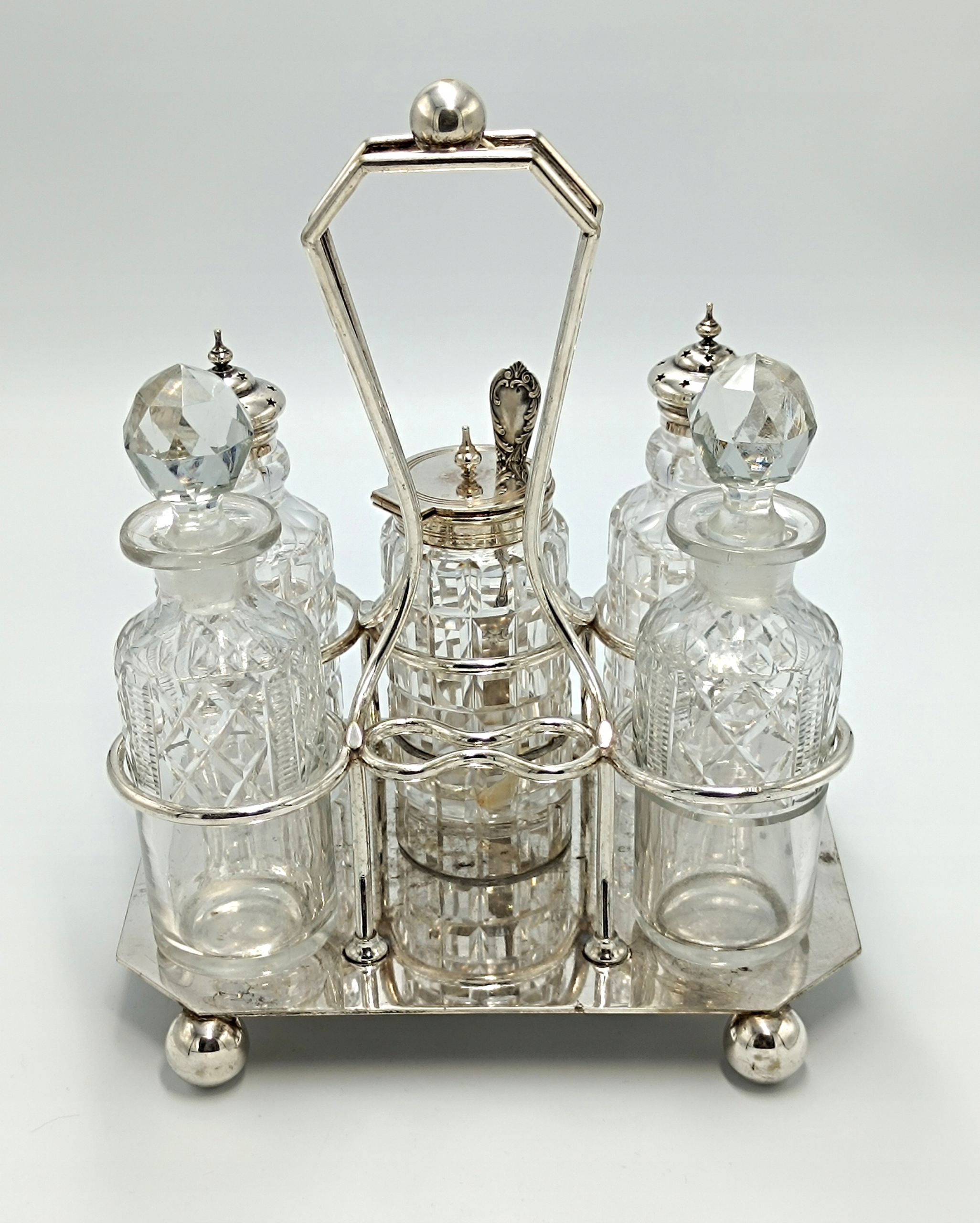 Представляємо елегантне кабаре зі спеціями, створене в першій половині 20 століття англійською компанією D&A (Daniel&Arter), яка була заснована в кінці 19 століття Томасом Генрі Деніелом і Томасом Річардом Артером. Посріблена підставка зі спеціальними місцями для кришталевих ємностей, а також 2 ємності для глека, 2 ємності для олії та оцту, 2 ємності для солі та перцю та ємність для гірчиці з посрібленою ложечкою створюють вишукане ціле підставку та EPNS – електричний знак Plated Nickel Silver, що перекладається як PLATED Nickel Silver. Це кабаре стане чудовим елементом сервірування столу.
