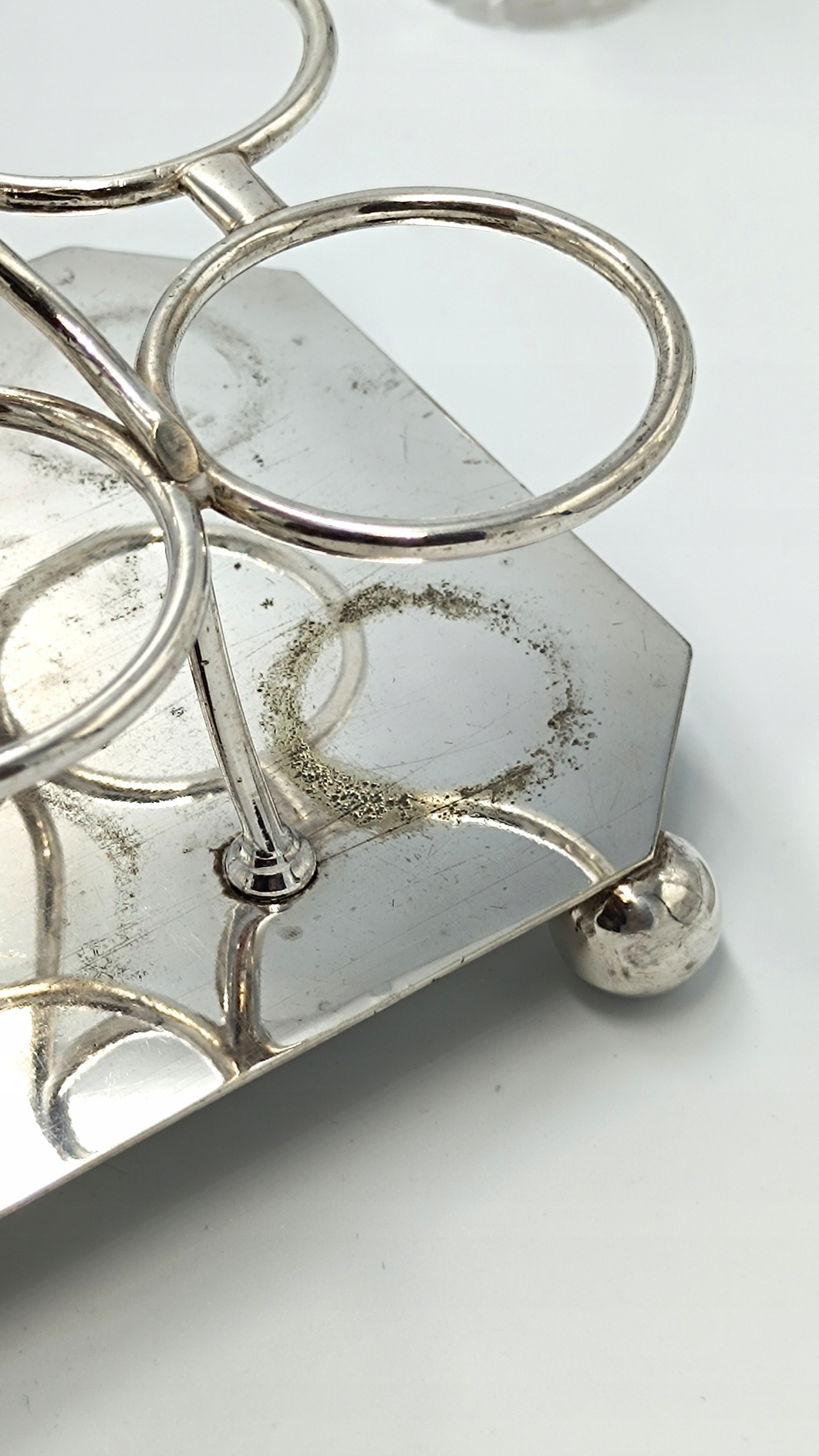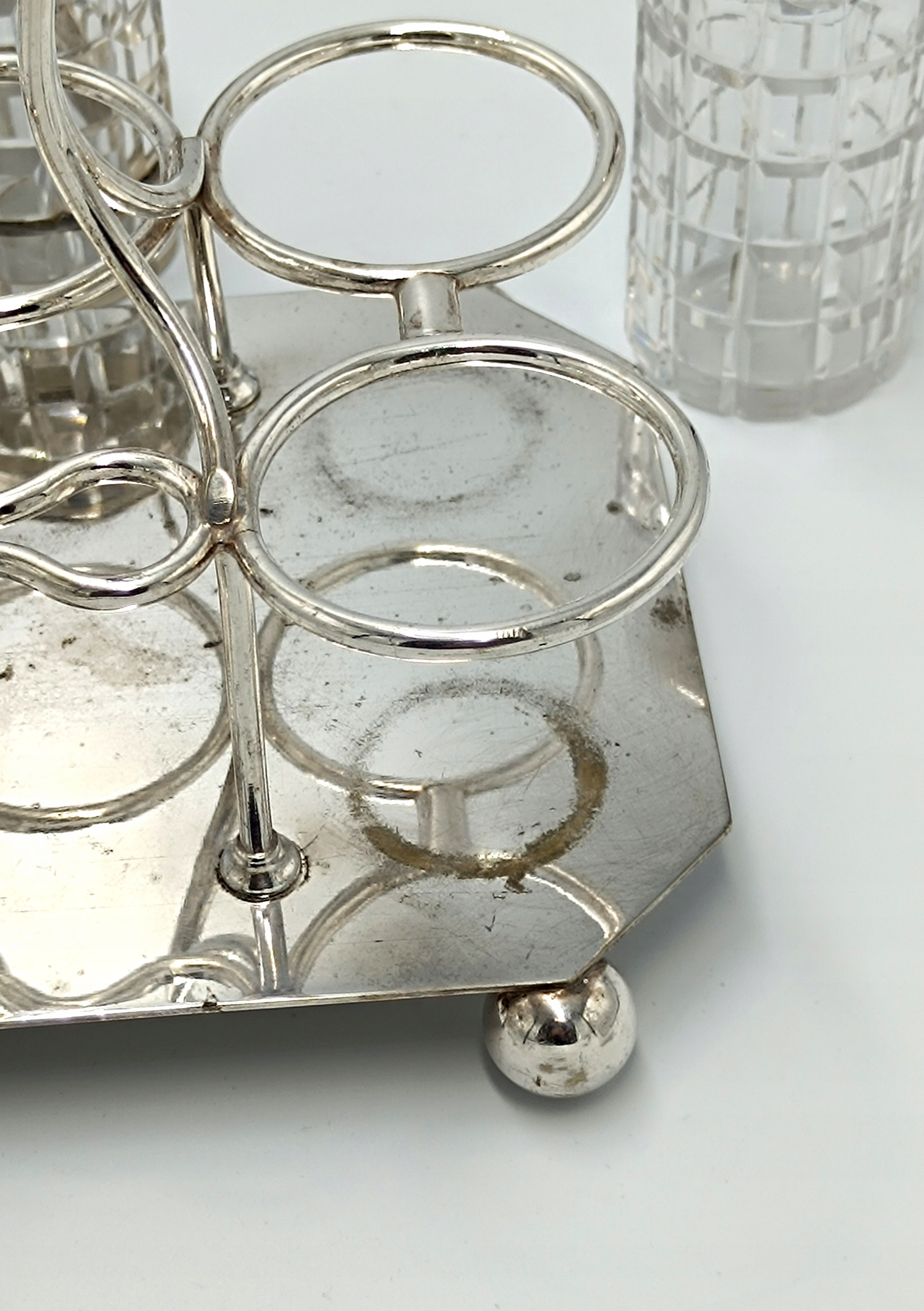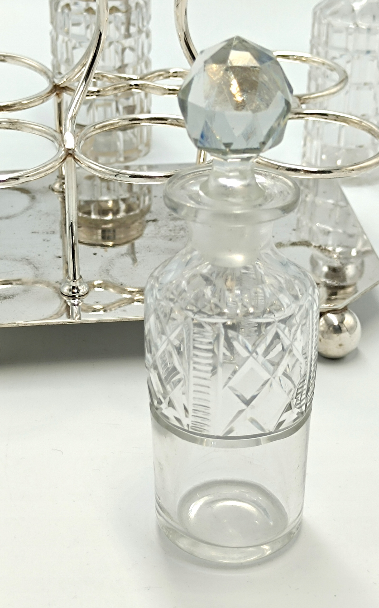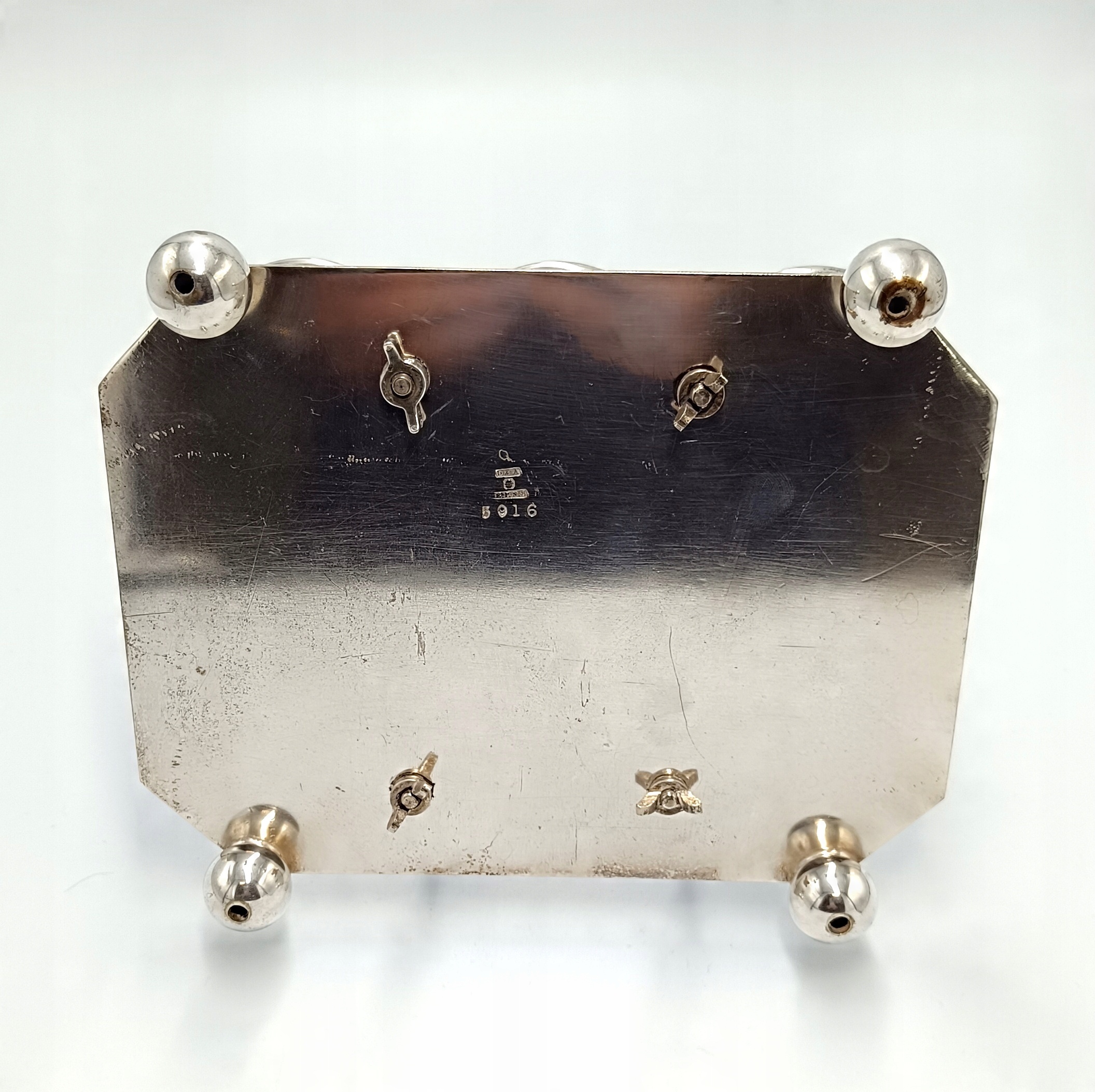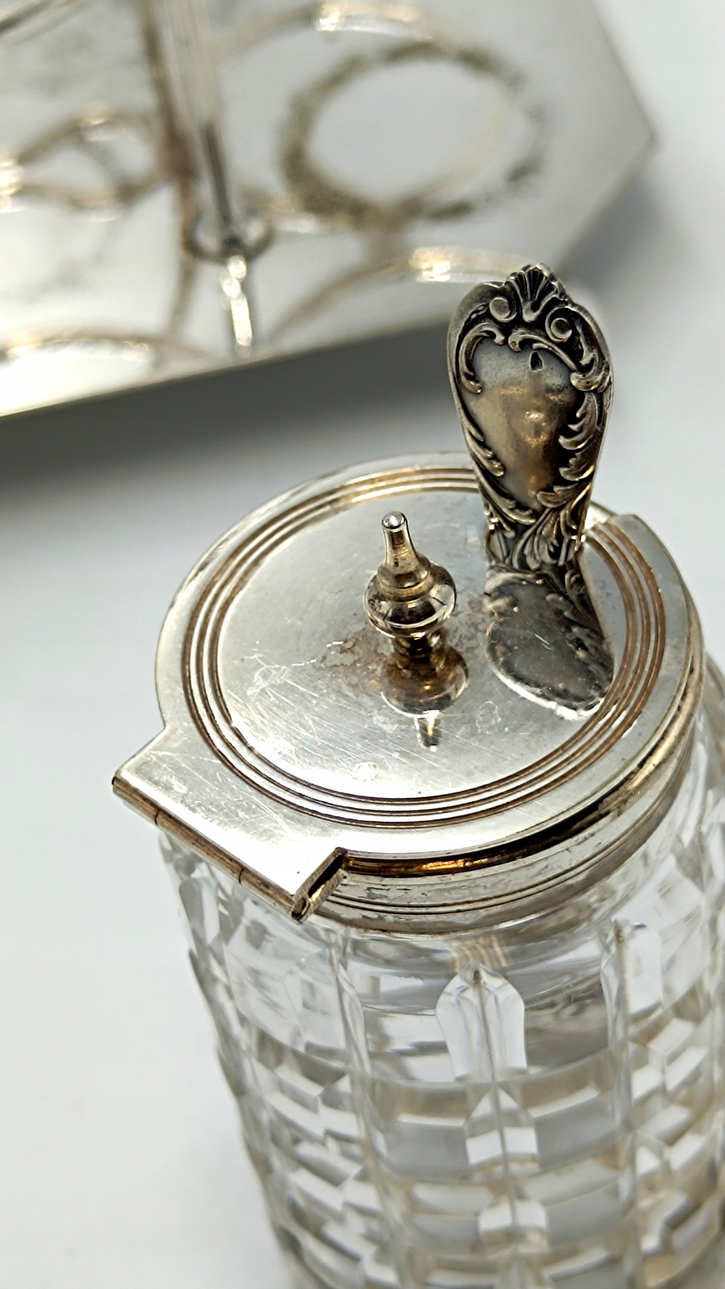 Представляємо елегантне кабаре зі спеціями, створене в першій половині 20 століття англійською компанією D&A (Daniel&Arter), яка була заснована в кінці 19 століття Томасом Генрі Деніелом і Томасом Річардом Артером. Посріблена підставка зі спеціальними місцями для кришталевих ємностей, а також 2 ємності для глека, 2 ємності для олії та оцту, 2 ємності для солі та перцю та ємність для гірчиці з посрібленою ложечкою створюють вишукане ціле підставку та EPNS – електричний знак Plated Nickel Silver, що перекладається як PLATED Nickel Silver. Це кабаре стане чудовим елементом сервірування столу.