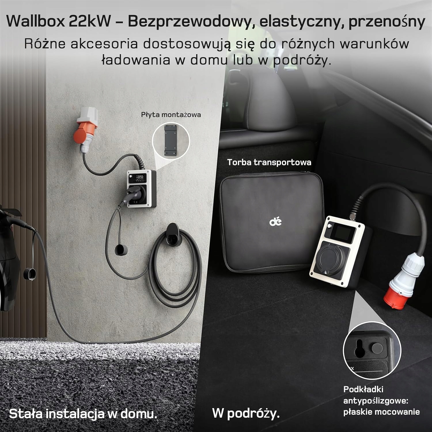- Mobile wallbox. Цей мобільний настінний зарядний пристрій із зарядним пристроєм AC Mode 3 потужністю 22 кВт дозволяє зручно заряджати вдома, під час подорожі або як зарядну станцію. Вилки CEE потужністю 11 кВт (трифазні) сумісні з більшістю промислових розеток у ЄС.