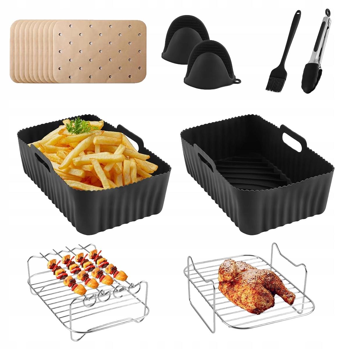 Спеціально розроблений для подвійних фритюрниця з ємністю 7,6 л -9,5 л. Наші аксесуари для подвійних фритгійних фритюків ідеально відповідають фритюрнику Foodi Foodi [AF300EU] [AF400EU] [AF451EU], Tower [T17088], EMTRONICS [emafdd9lsl], Mustant Vortex плюс подвійним фрагментом повітряного повітря та іншими аерофриками з потужністю близько 7,6 л. і більше. Також сумісні з більш великими фрі, але вони можуть здатися трохи меншими. Їх можна вимивати в посудомийній машині, вони стійкі до іржі і дуже прості в очищенні, що дасть вам спокій. Порада: Якщо частини силікону важко очистити, просто замочіть їх у теплій воді, а бруд зникне, ніби магією!