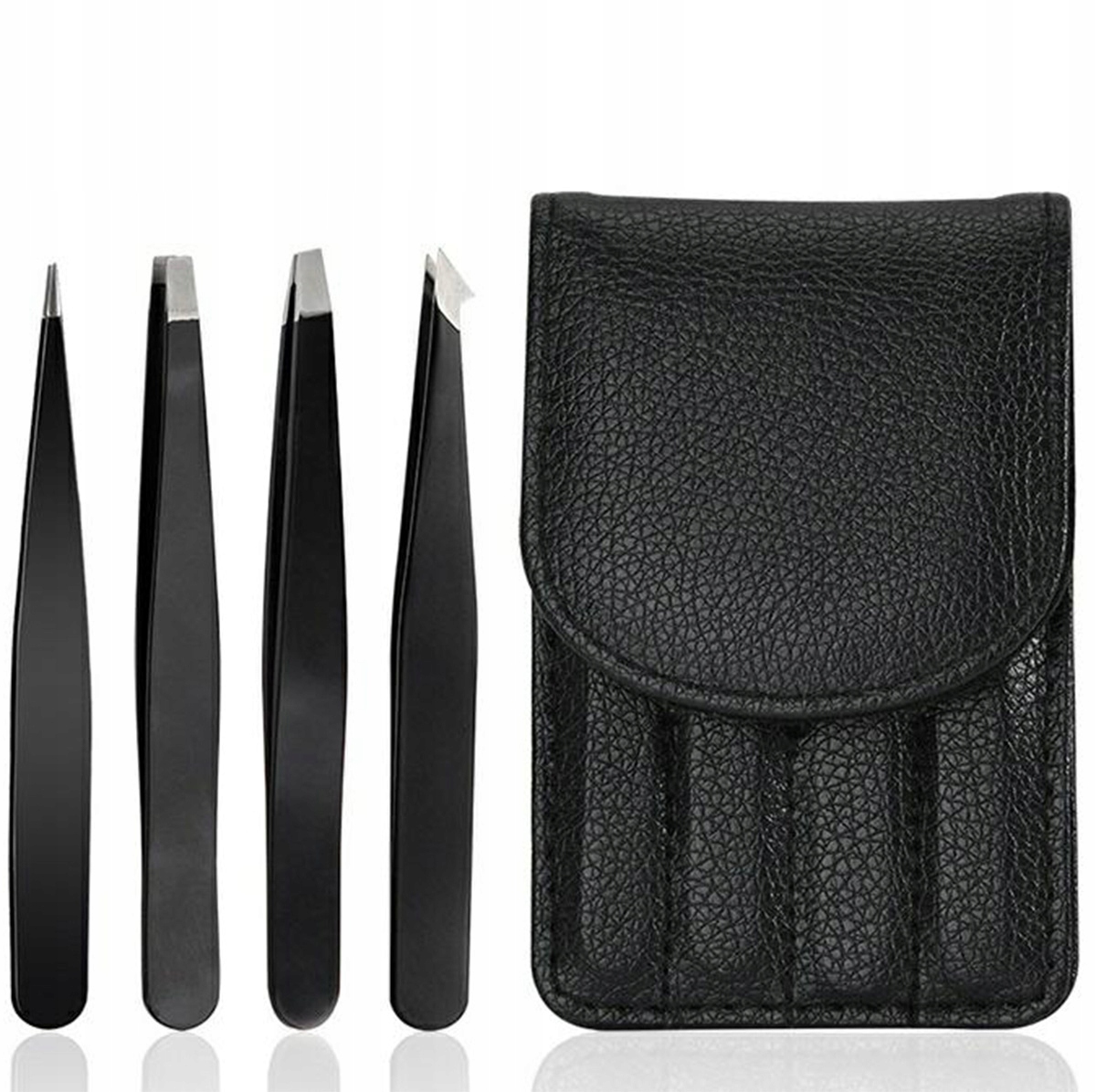 Набір з 4 професійних пінцетів для коригування вій і брів. Виготовлений з міцної та міцної нержавіючої сталі. Оснащений довгою зручною ручкою, що полегшує моделювання. У набір також входить футляр з екошкіри для їх зберігання.