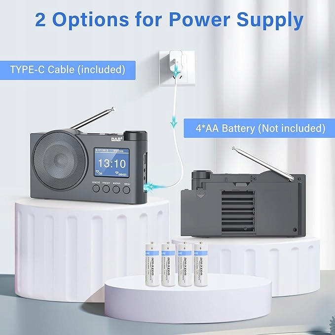 Наше радіо надзвичайно універсальне завдяки двом режимам живлення: воно може працювати як на мережевій потужності через кабель USB-C, так і чотири батареї AA (не включені). Легкий, компактний дизайн вагою 350 г робить його ідеальним для використання вдома та на подорожі. Він також пропонує можливість прослуховування використання роз'єму для навушників, що дозволяє комфортно отримувати звук, не порушуючи спокою інших.