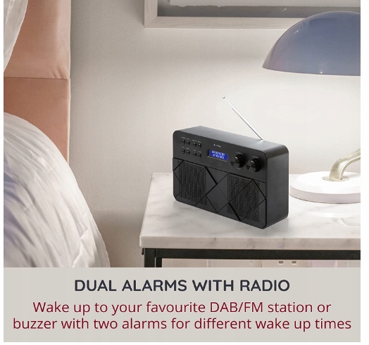 - ✔️ ПОДВІЙНИЙ БУДИЛЬНИК З ПЕРЕМИКАЧОМ СНУ: це сучасне радіо також є фантастичним будильником біля ліжка: завдяки функції подвійного будильника він дозволяє встановити два різні часи пробудження. Ви навіть можете прокидатися під улюблену DAB або FM-станцію в інший час, ніж ваш партнер. Завдяки регульованій функції сну ви можете встановити час у хвилинах, після якого радіо автоматично вимкнеться.