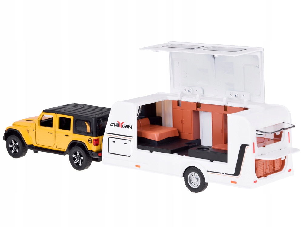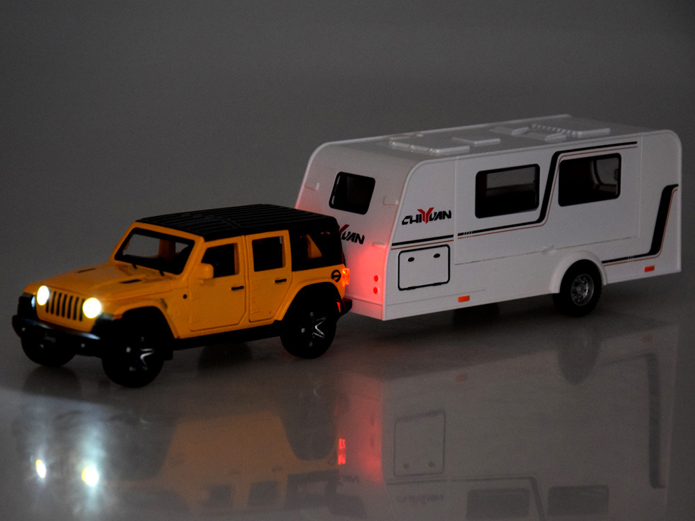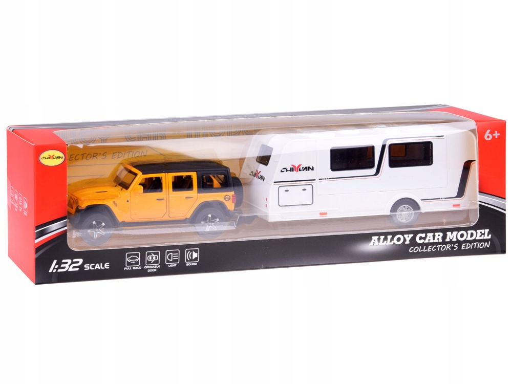 Позашляховик + караван - ідеальна іграшка, яка перенесе вашу дитину у світ святкових пригод! Металевий позашляховик був виготовлений з надзвичайною увагою до деталей, а світяться під час руху фари надають йому реалістичного вигляду. Модель у масштабі 1:32 ідеально відтворює популярний позашляховик, поєднуючи міцність і високу якість виготовлення пластику.