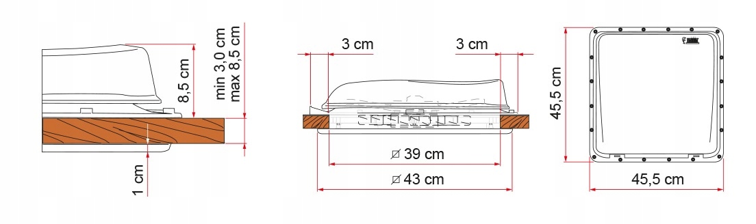 Взаємозамінні зі старими вікнами Fiamma 40x40 см і вікнами від 36x36 см до 42x42 см завдяки посиленій рамі.