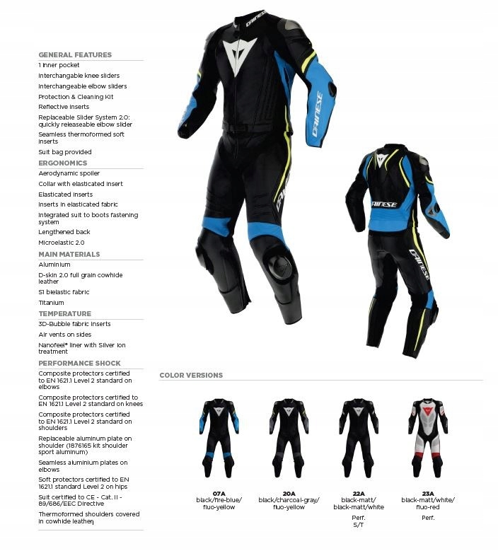 З 2009 року Laguna Seca встановила стандарт шкіряних костюмів. Його 4 покоління також забезпечує відмінний дизайн і новітні технологічні рішення, також у версії з двох частин. Збільшений аеродинамічний горб, ширші та змінні алюмінієві плечові повзунки, змінні колінні повзунки та (вперше в костюмах-двійках) новий дизайн протектора для ліктів із повзунками. Безпека гарантується неймовірно міцною і м'якою, спеціально запатентованою воловою шкірою D-Skin 2.0 і сертифікатом 2 рівня на весь костюм. Новітні гоночні технології - також забезпечують комфорт під час повсякденної їзди.
