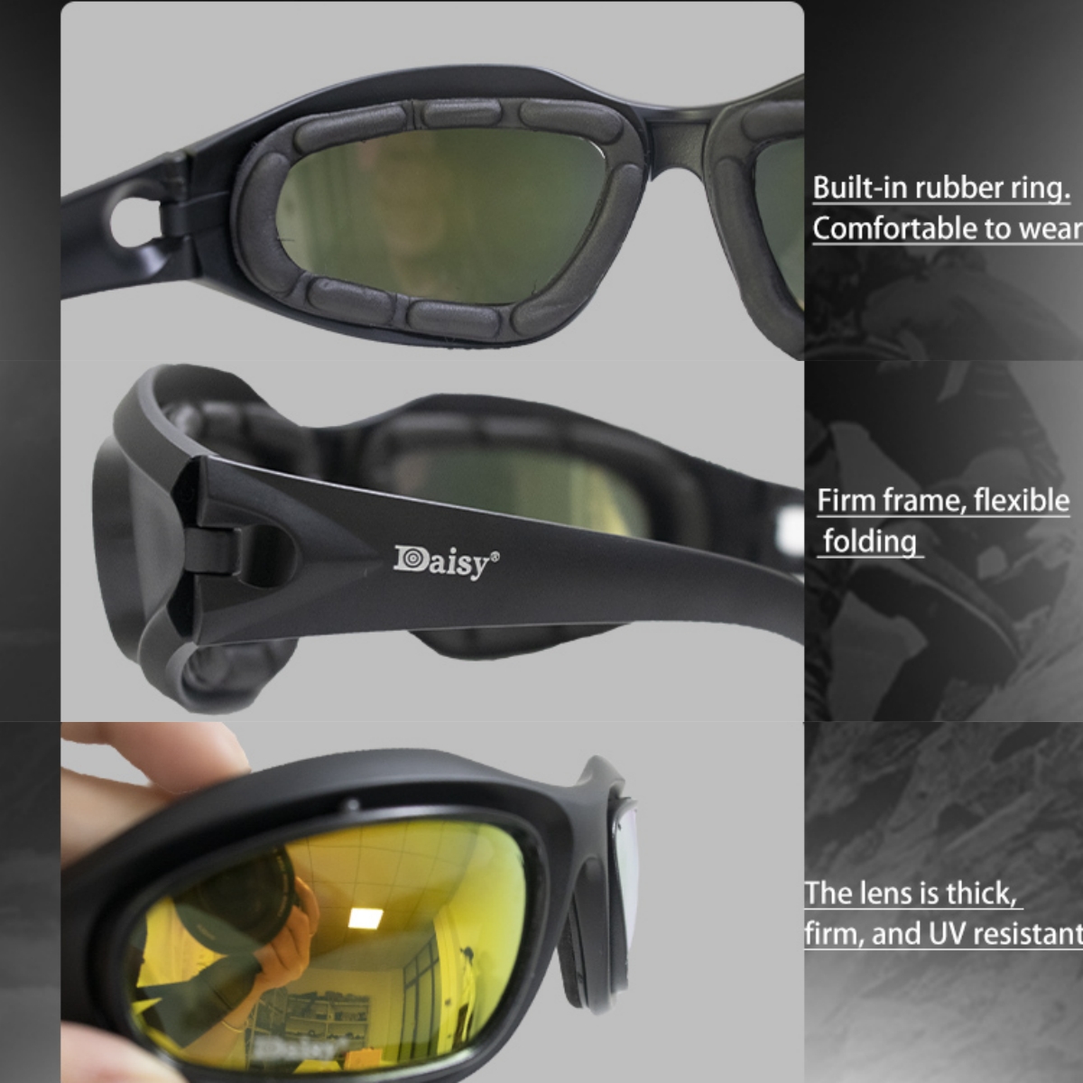 - Набір з багатьма лінзами: Набір включає 4 пари лінз, які можна обміняти залежно від навколишнього середовища та потреб, таких як чорні лінзи (поляризовані), прозорі лінзи, жовті лінзи, мідні лінзи тощо для задоволення потреб. 4 Проникнення вітру, пилу, піску тощо і захищає очі.