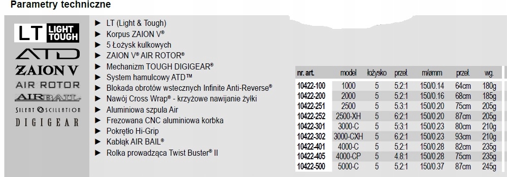 Останнє покоління популярної серії DAIWA Exceler LT стало міцнішим і легшим, ніж будь-коли, завдяки використанню інноваційного матеріалу Zaion Light. Надзвичайно міцний Zaion Light забезпечує підвищену стійкість до деформації при зменшенні ваги. Корпус гарантує ідеальну стійку опору для плавно працюючого механізму. Конструкція LT разом із механізмом Tough Digigear покращує ефективність передачі сили, збільшує довговічність і тягову силу. Гальмо ATD працює точно, швидко запускається і забезпечує високу гальмівну силу. Шпуля Longcast ABS, виготовлена з авіаційного алюмінію, має оптимізовану структуру краю, яка зменшує тертя під час закидання, значно збільшуючи досягнуту відстань. Алюмінієва ручка прикручується безпосередньо до корпусу котушки.