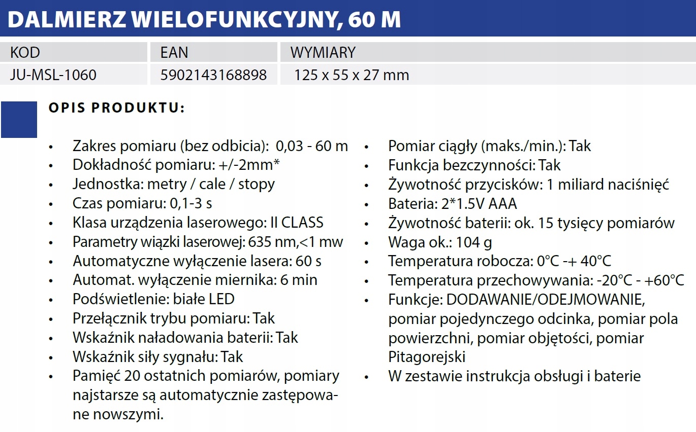 - Функції: вимірювання однієї секції ADD/SUBSTRACT, вимірювання площі поверхні, вимірювання об’єму, вимірювання за теоремою Піфагора, запам’ятовування останніх 20 вимірювань,