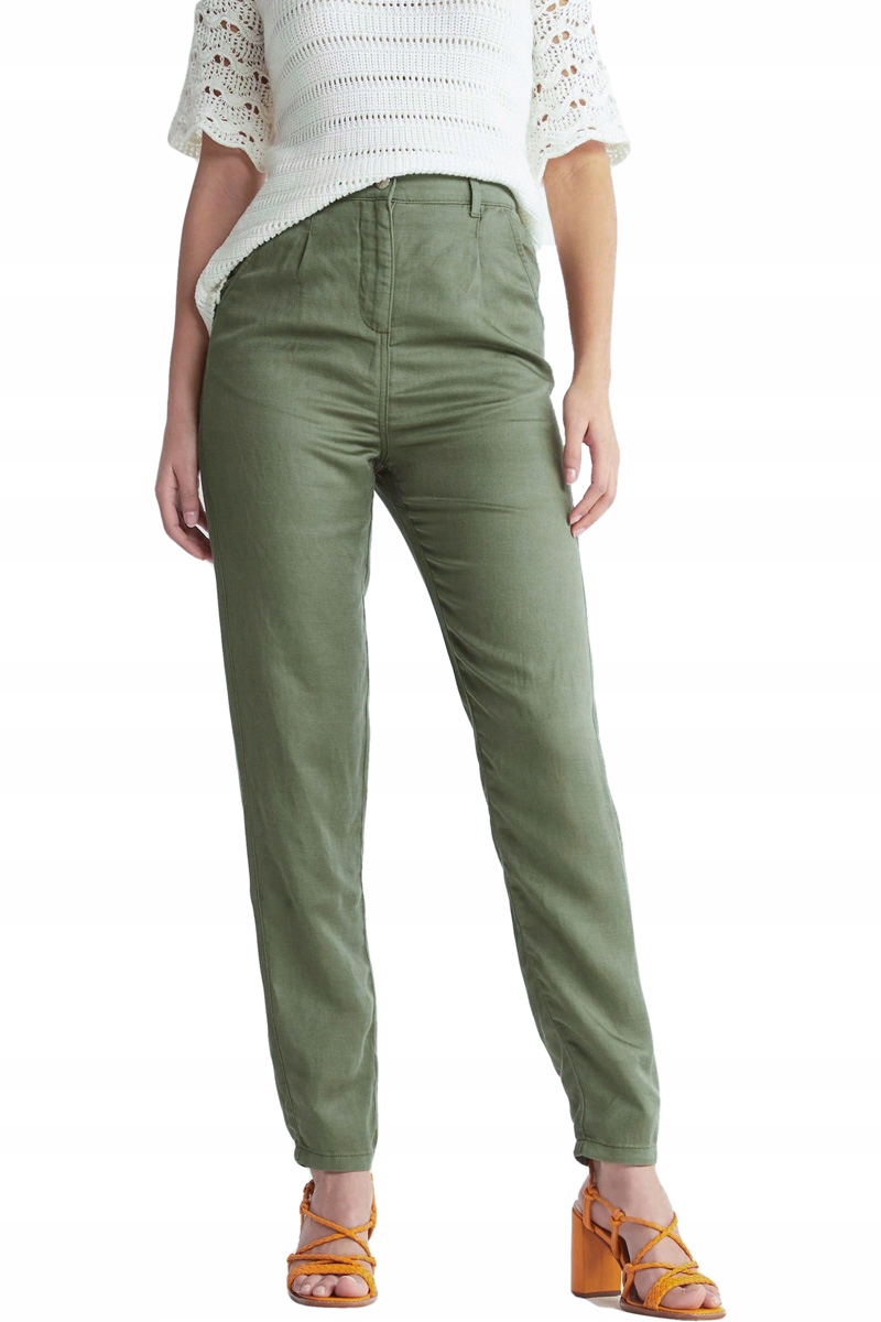 Нові лляні штани від Next оливкового відтінку. Довжина Long. Штани з високою талією. Застібається на блискавку і гудзик. Шлевки на талії. Дві кишені спереду і дві кишені ззаду. Злегка завужені ніжки.