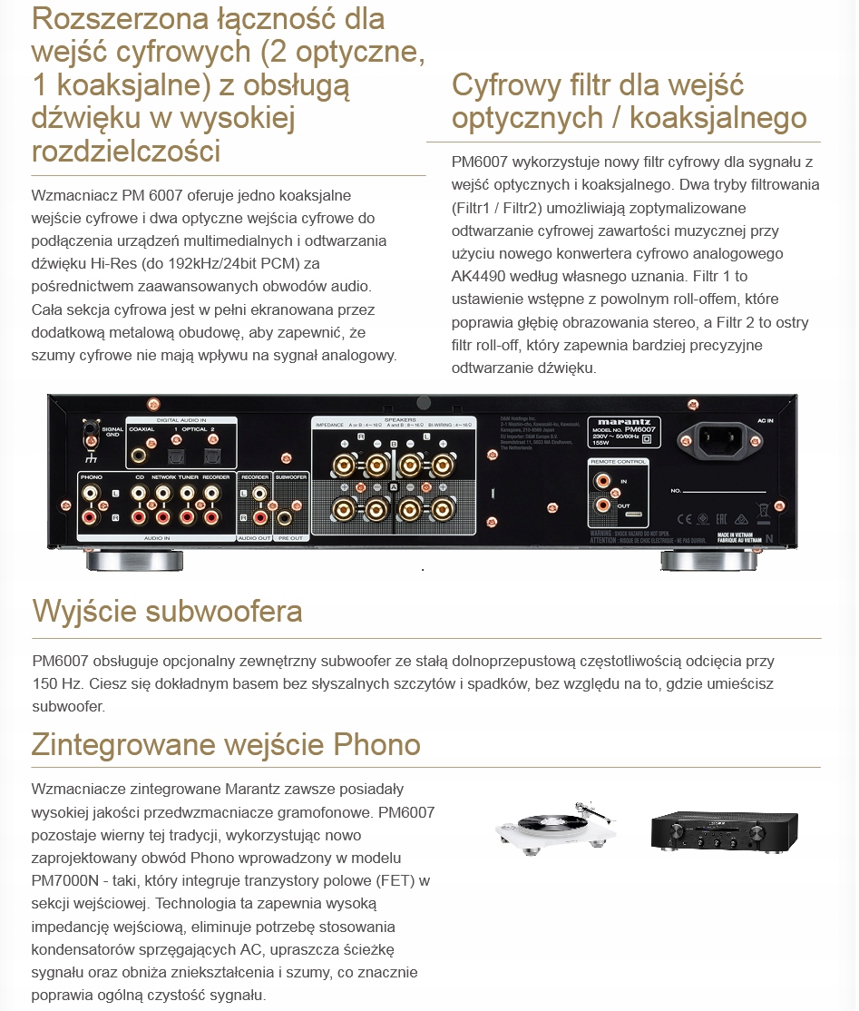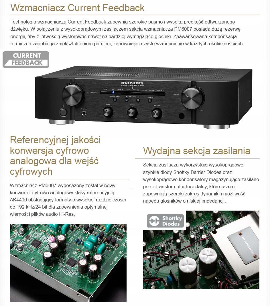 Marantz PM6007 є продовженням надзвичайно успішної лінійки підсилювачів, багато оснащених цифровими входами, і, перш за все, переможцем тесту на найкращий стереопідсилювач у класі до 600 фунтів стерлінгів у престижному британському журналі "WHAT*HiFi".