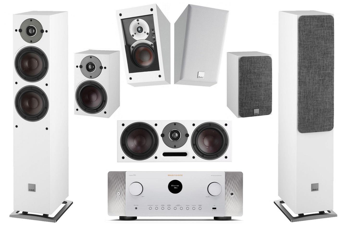 Dali Oberon білий/білий 7.0 Dolby Atmos + мережевий домашній кінотеатр Marantz Cinema 60 7.2 із Dolby Atmos, DTS:X, 8K Ultra HD у сріблястому кольорі.