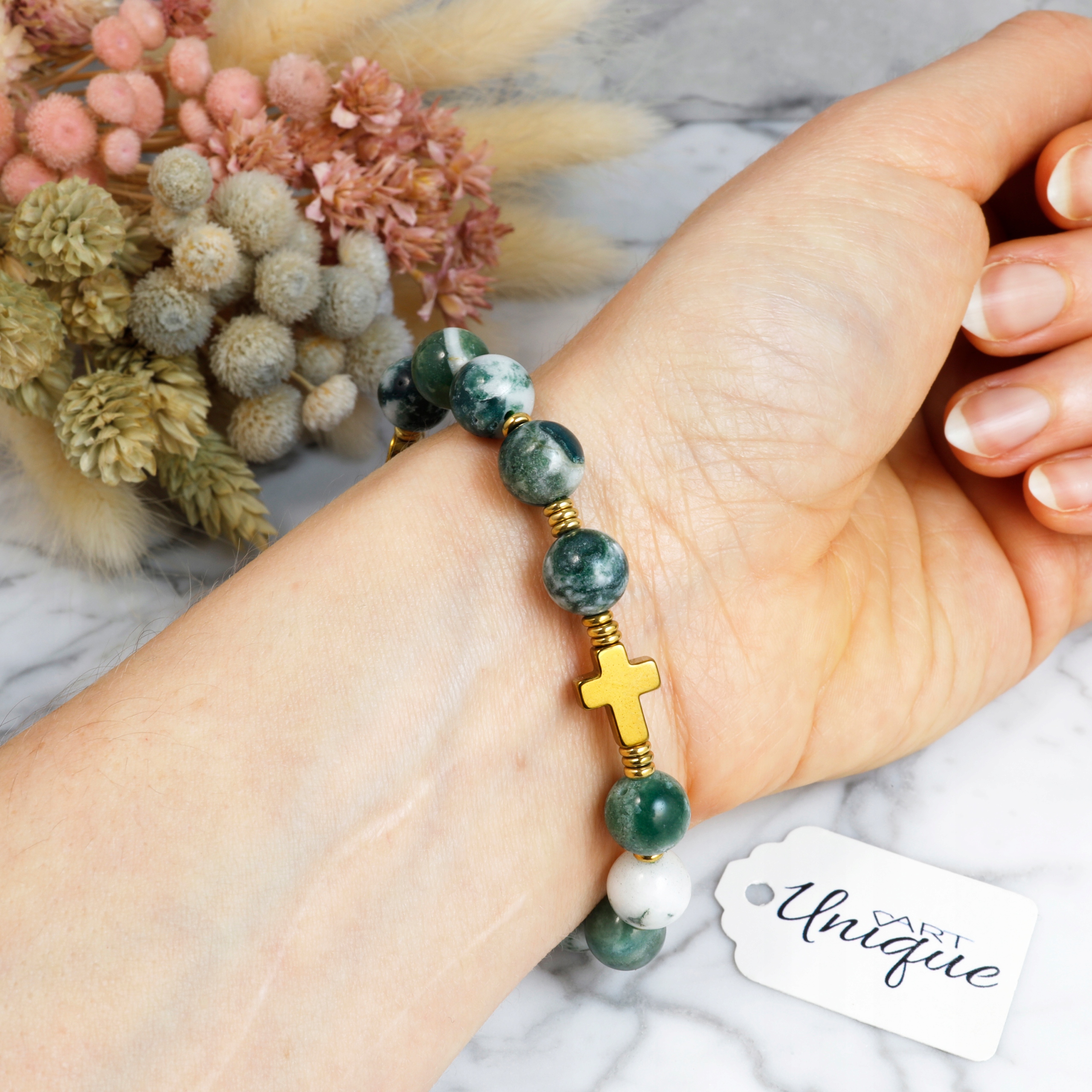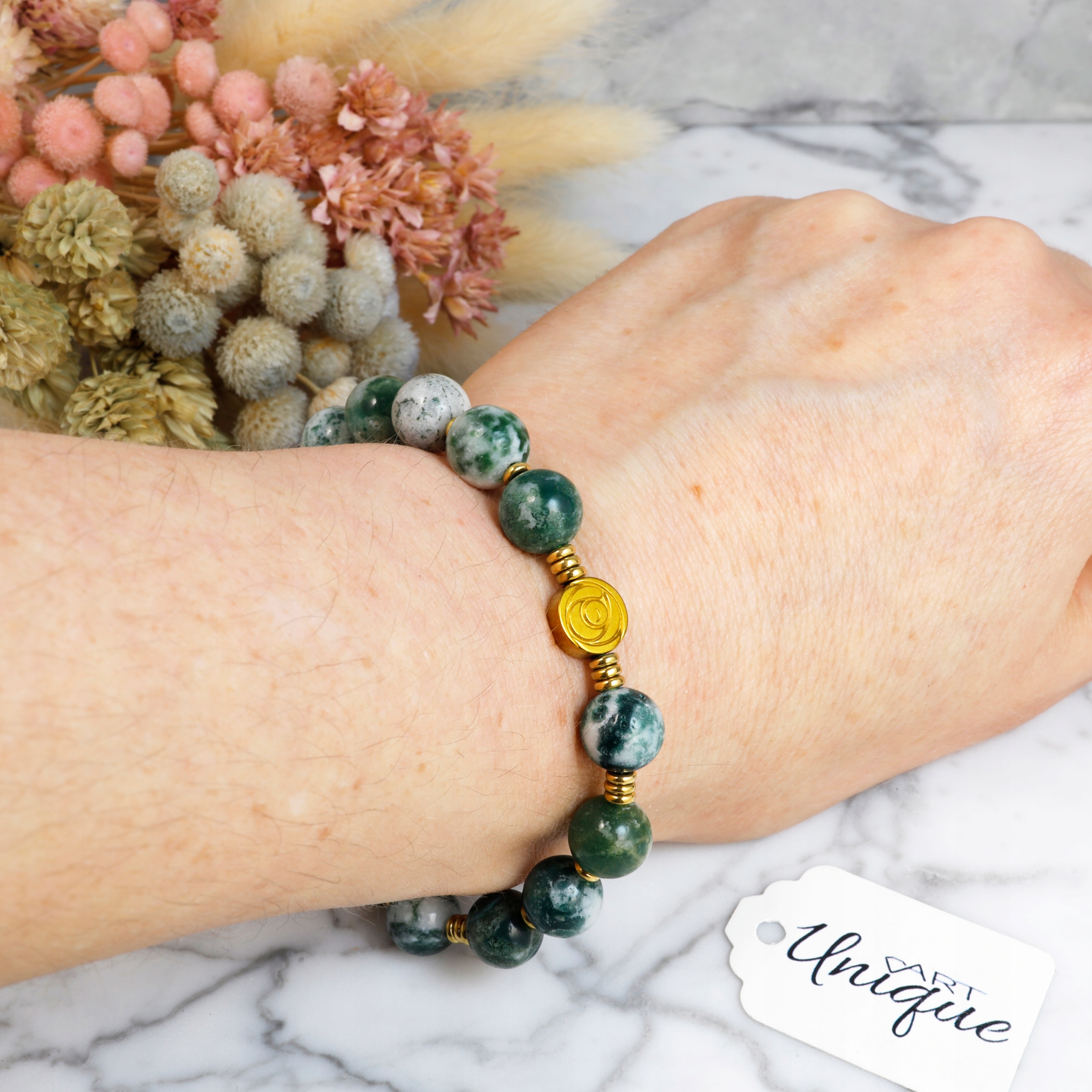 ✅ Тип і колір каменів: моховий агат зелено-білих відтінків і золотистий гематит