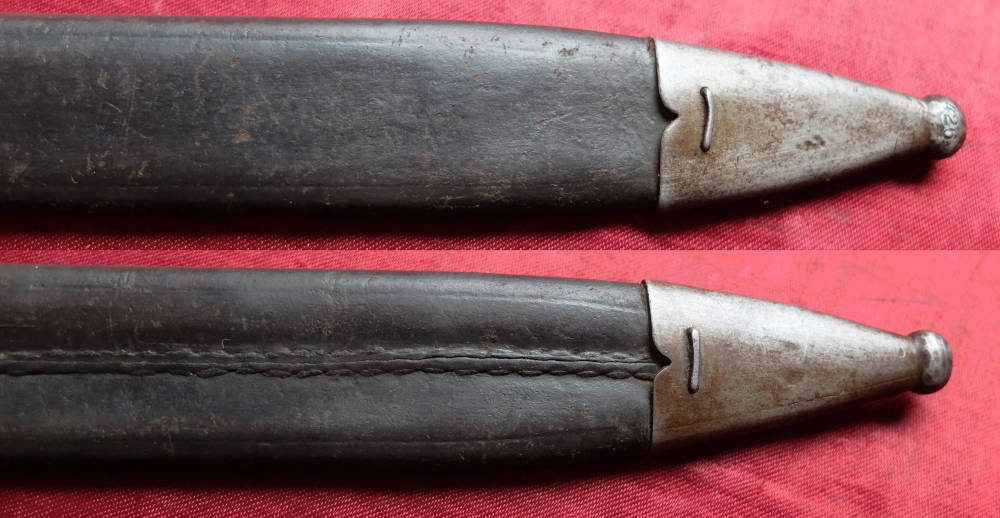 Піхви шкіряні з металевою фурнітурою. Шкіра дуже добре збереглася, без пошкоджень, без заломів. Оригінальний шов зберігся. На м'ячі вибита цифра426. Лезо добре лягає в піхви. Відсутній багнетний замок.