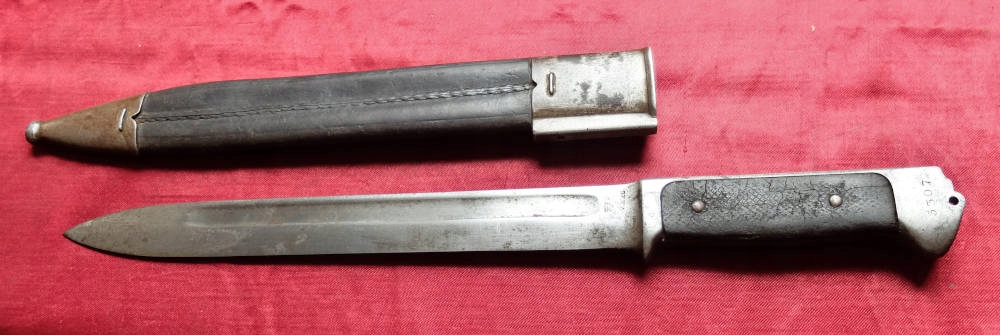 Товар на фото. Він добре зберігся. Клинок невідточений, заточений в епоху. На порозі клинка клеймо фабрики Weyersberg & Kirschbaum у Золінгені - голова короля та лицаря та літери W.K.&Co (клеймо трохи нерозбірливо). На наконечнику є полкове маркування 16B.511 (16-й батальйон, номер зброї 511) і заводський номер гвинтівки 5307, на яку встановлено багнет. Накладки на ручки оригінальні, виготовлені із загартованої шкіри. Багнетний замок відсутній.