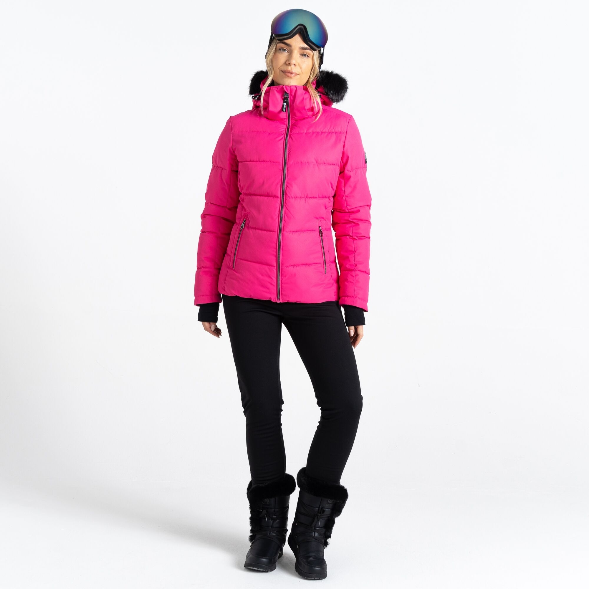 Жіноча лижна куртка-пуховик Glamorize IV. Стильна та функціональна куртка дозволить вам виглядати модно на схилах завдяки м’якому дизайну та знімній обробці капюшона зі штучного хутра. Виготовлений із турботою про навколишнє середовище з нашої водонепроникної та дихаючої переробленої тканини ARED 10000, він забезпечує вам сухість і комфорт на схилі. Теплий наповнювач і теплі внутрішні манжети на рукавах не пропускають холод. Оснащений кишенею для лижного абонементу та знімним стегновим поясом, ідеально підходить для сніжних днів.