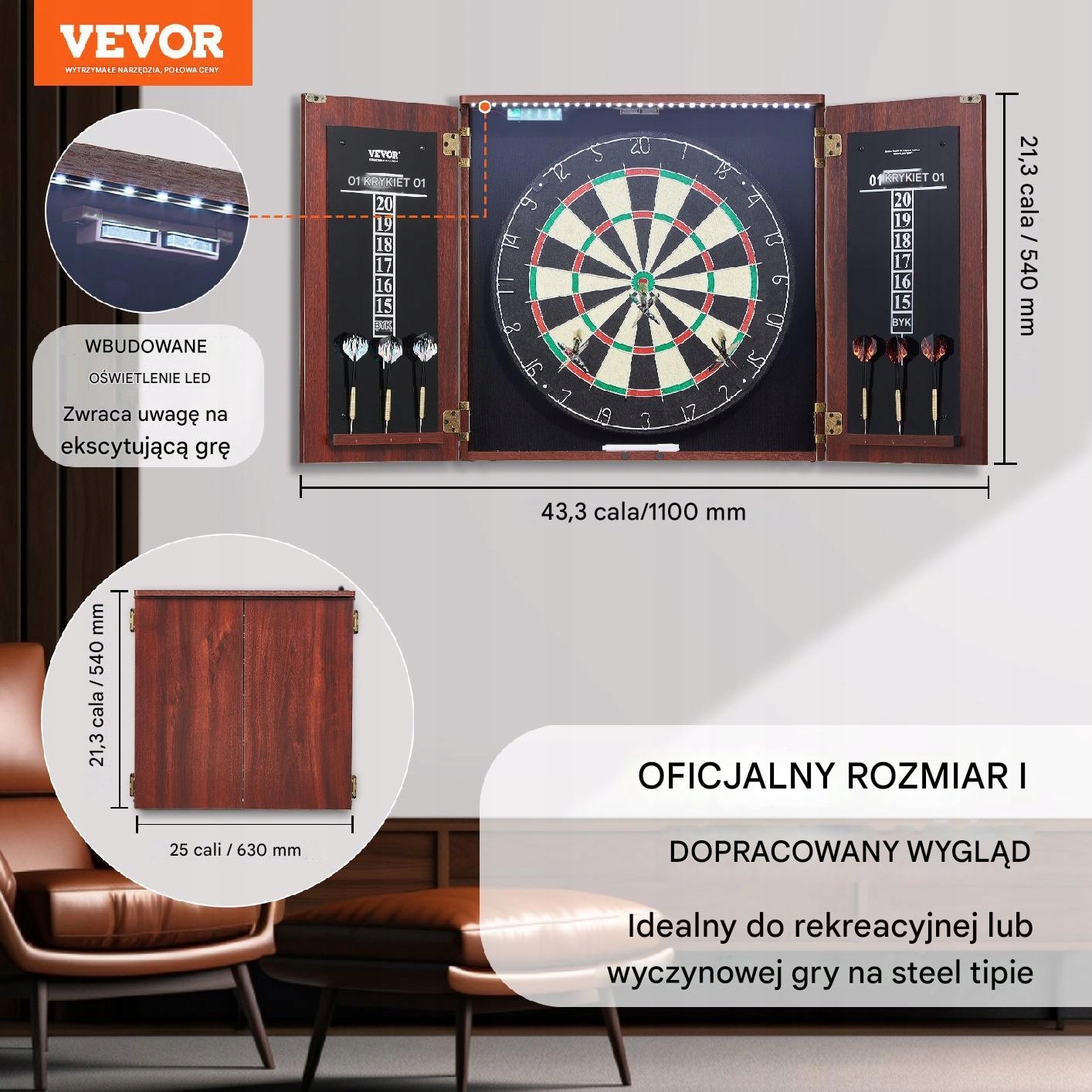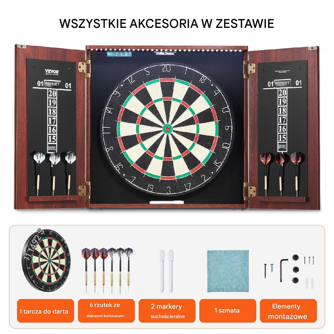 набір щитів з дартами з шафою - офіційний розмір, набір аксесуарів, сталеві дартс