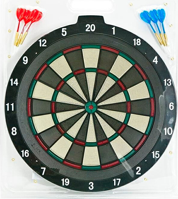 Вміст упаковки - це щит (діаметром 18 ") з пластику з набором з шести софт -дартс (пластикова печера).