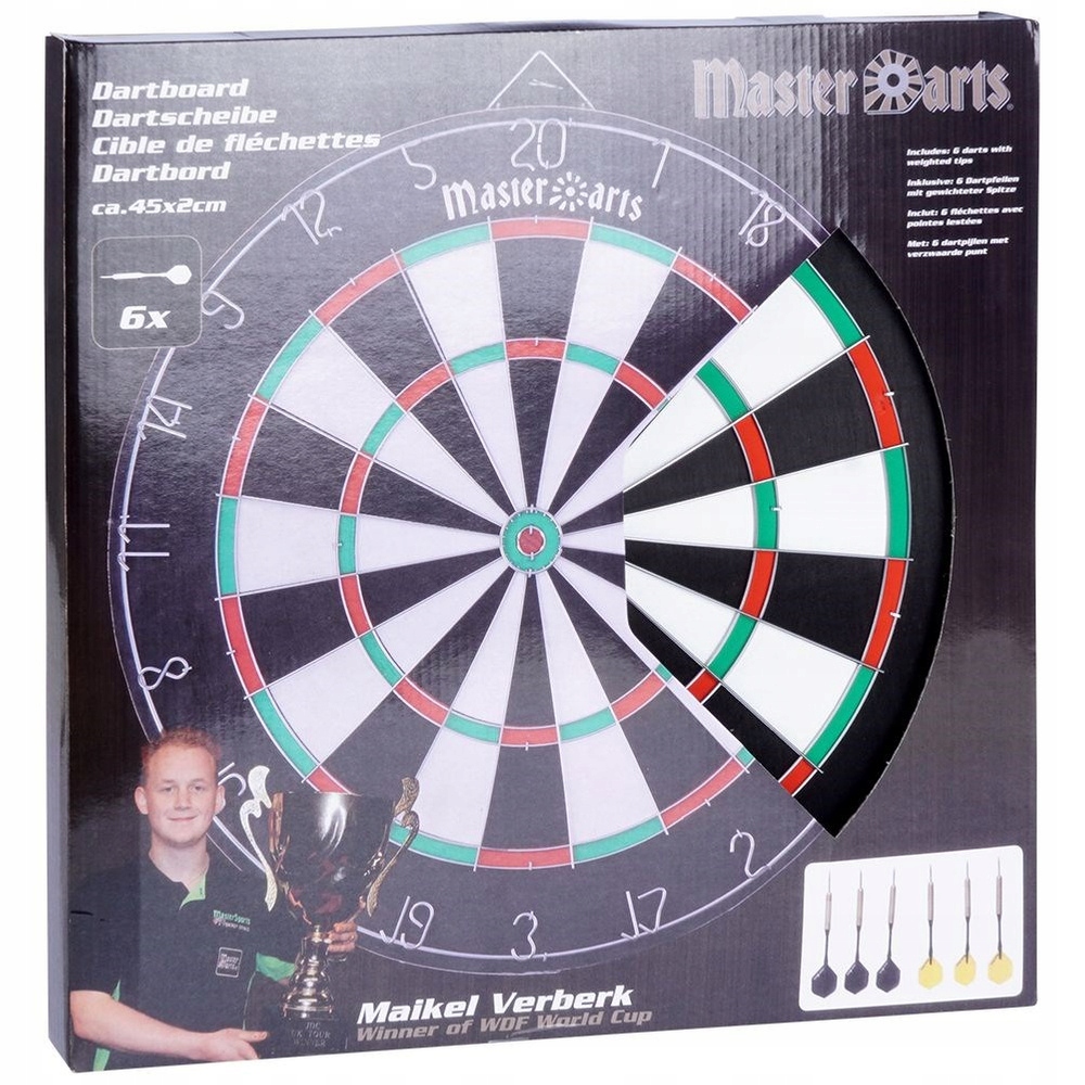 Двостороння дошка для дартсу з дротиками ідеально підходить для соціальної гри в дартс. Завдяки цьому ви зможете приємно провести час з друзями, а два циферблати подарують багато годин чудового задоволення. Щит відмінно підійде як вдома, так і в барі чи клубі. Дартс не працює від батарейок, тому ви можете грати в нього і в саду. Оригінальний продукт голландського бренду Master Darts. Вироблено відповідно до європейських стандартів.