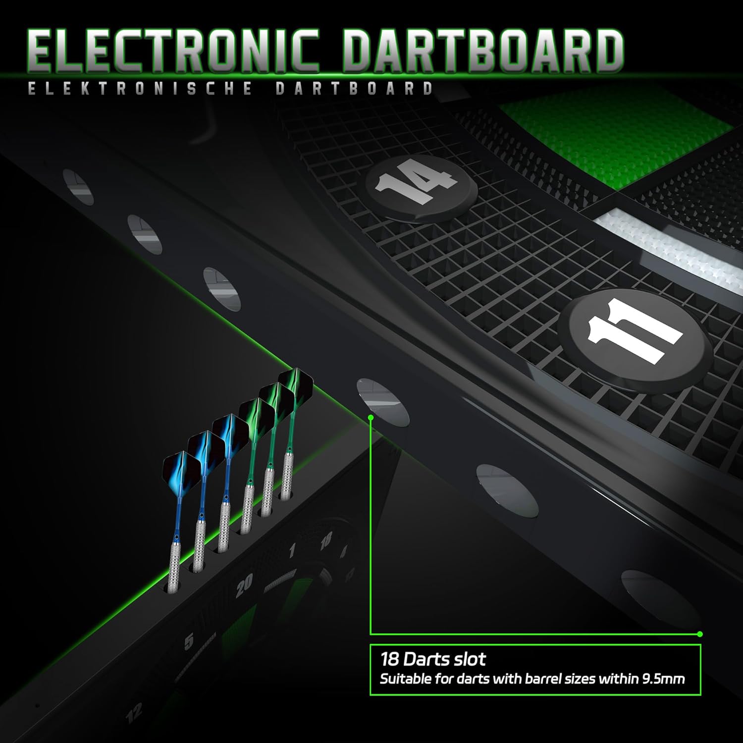 - 13,5 мм, сегменти зменшують відбиття, сегменти, перевірені для інтенсивного використання, і витримують найпотужніші кидки. Дартс -циферблат виготовлений з високоякісної поліпропілену, а поза зоною проекції довжиною 35 см є крапка, що захищає кільце, захищаючи стіни та дротики від нефірму