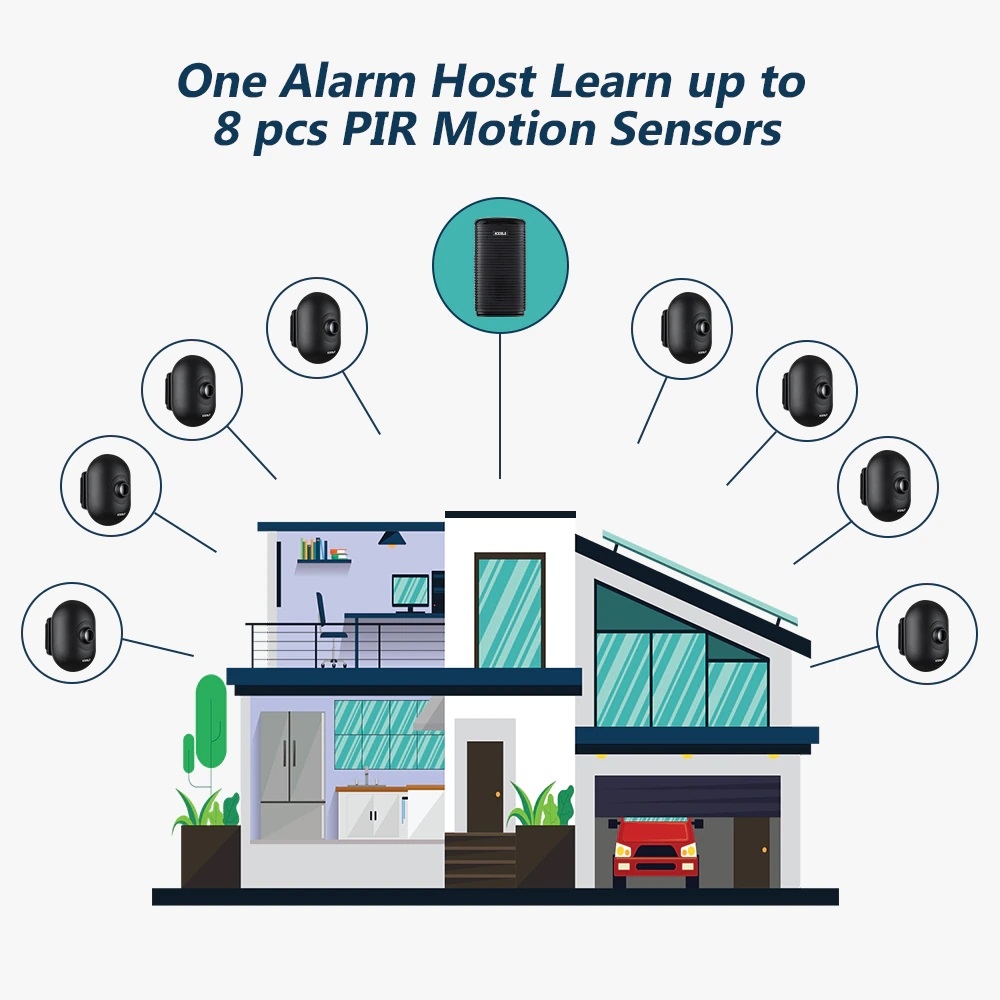 - Супер прості установки: немає кабелів, що не можна запускати, не виникають проблем з установкою. Покладіть акумулятори та покладіть бездротовий зв'язок із датчиком руху та приймачем тривоги в будь -якому місці. Приймач і датчик поєднуються після зняття з коробки, ви будете діяти протягом декількох хвилин.