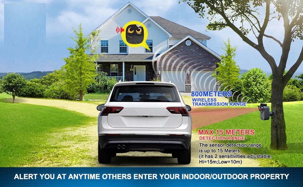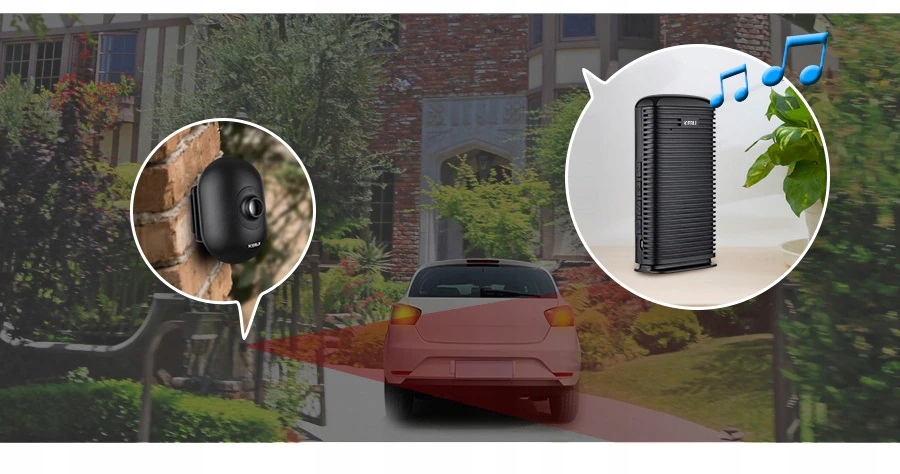 - Дуже тривалий час роботи акумулятора: приймач може живитися як від джерела живлення, так і від акумулятора, тоді як датчик працює від 2 акумуляторів AA, які можуть тривати щонайменше півроку (кожен зовнішній датчик може бути спрацьований у 35 000 разів). Акумулятор довго використовуйте, що вам не доведеться триматися на акумуляторі та приймати з собою тривогу під'їзду під час подорожі до кемпінгу