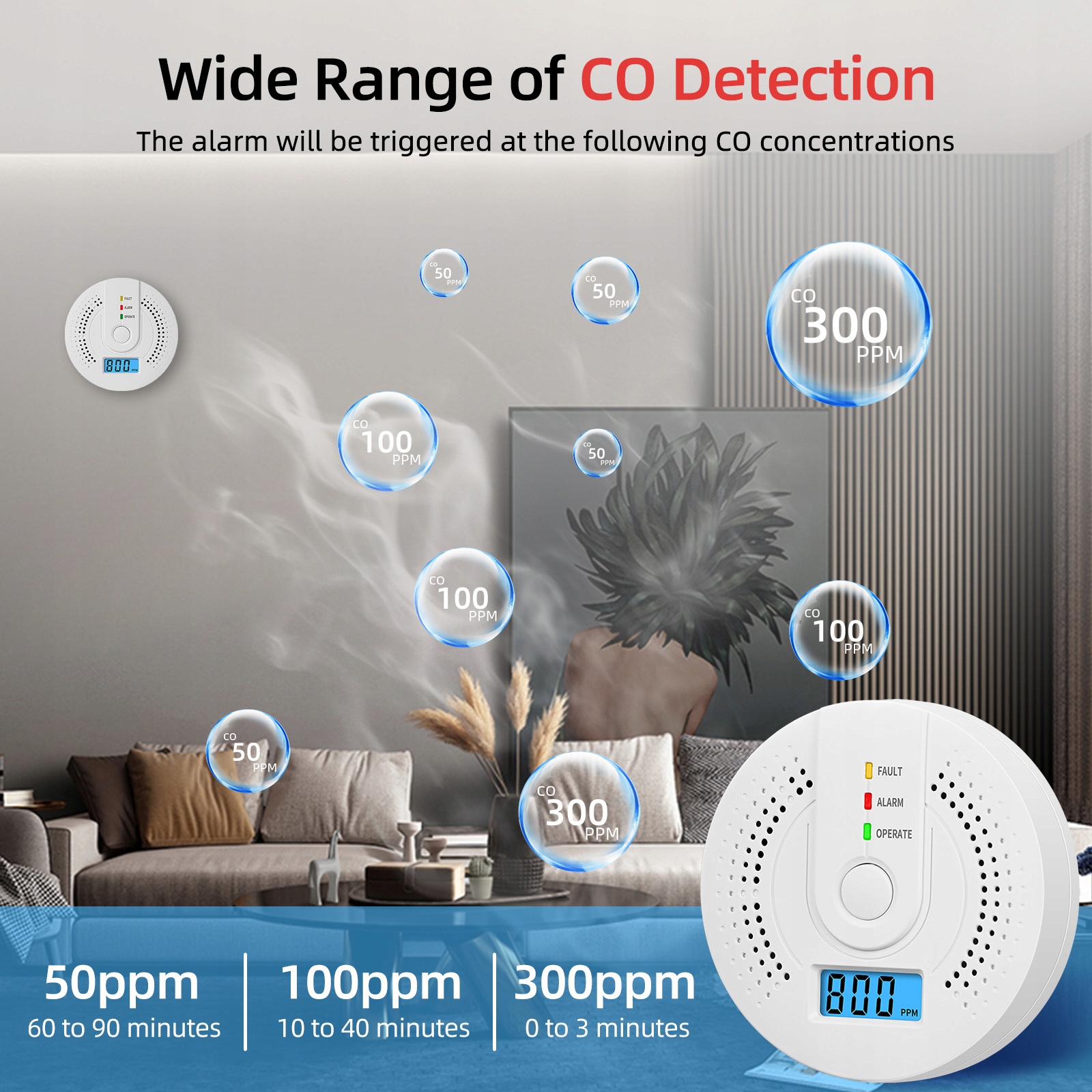 Функція:1. 【Портативний і зручний для подорожей】: цей детектор CO розроблений як компактний і портативний, що робить його ідеальним для використання в дорозі та поза ним. Він легко поміщається у вашу сумку чи багаж, забезпечуючи захист від чадного газу, куди б ви не пішли. І стандарт тривоги: 50 ppm, тривога протягом 60-90 хвилин; 100 ppm, тривога протягом 10-40 хвилин; 300 ppm, сигналізація протягом 3 хвилин.