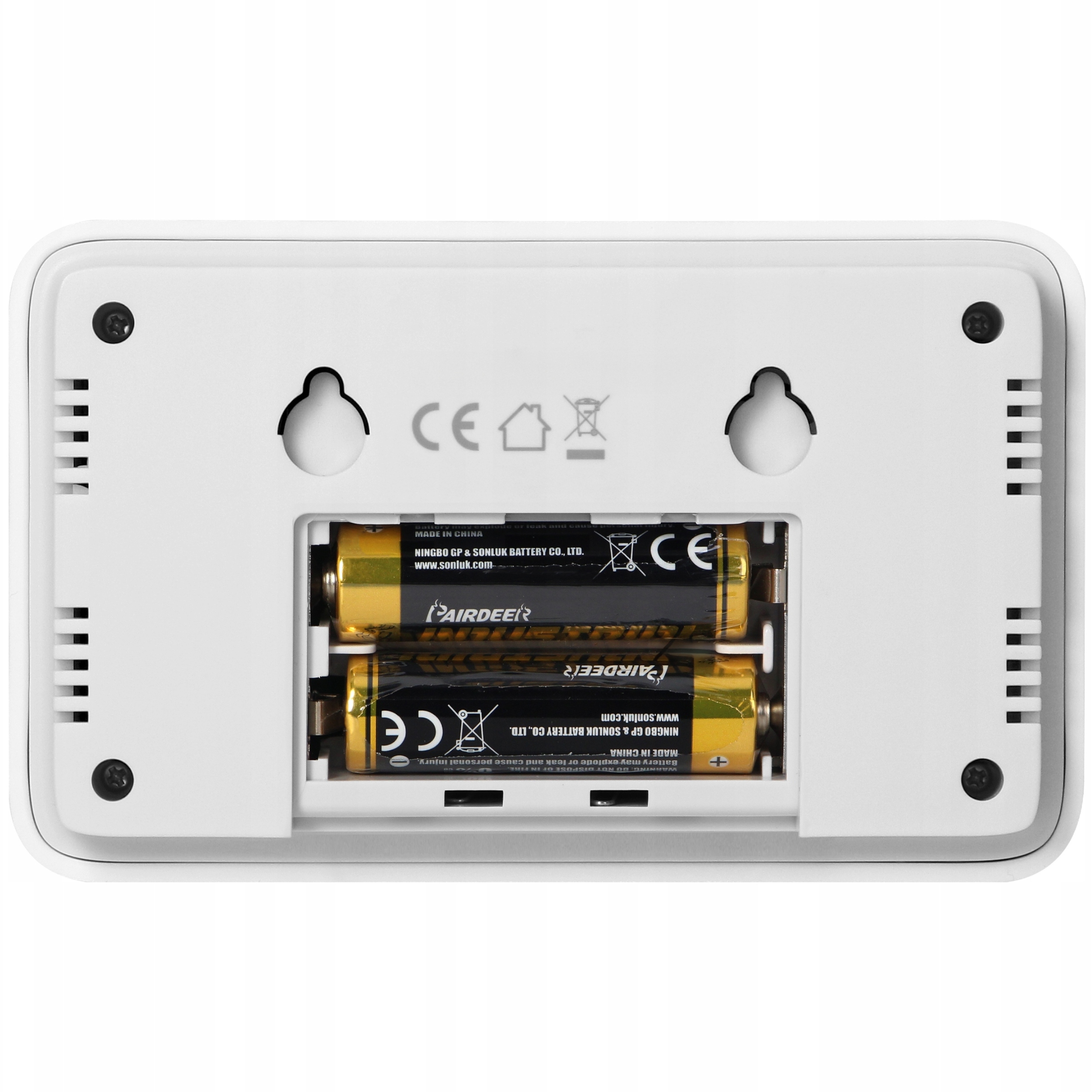 Датчик живиться від з двома акумуляторами AA (включені) і сигналізує про їх низький рівень.