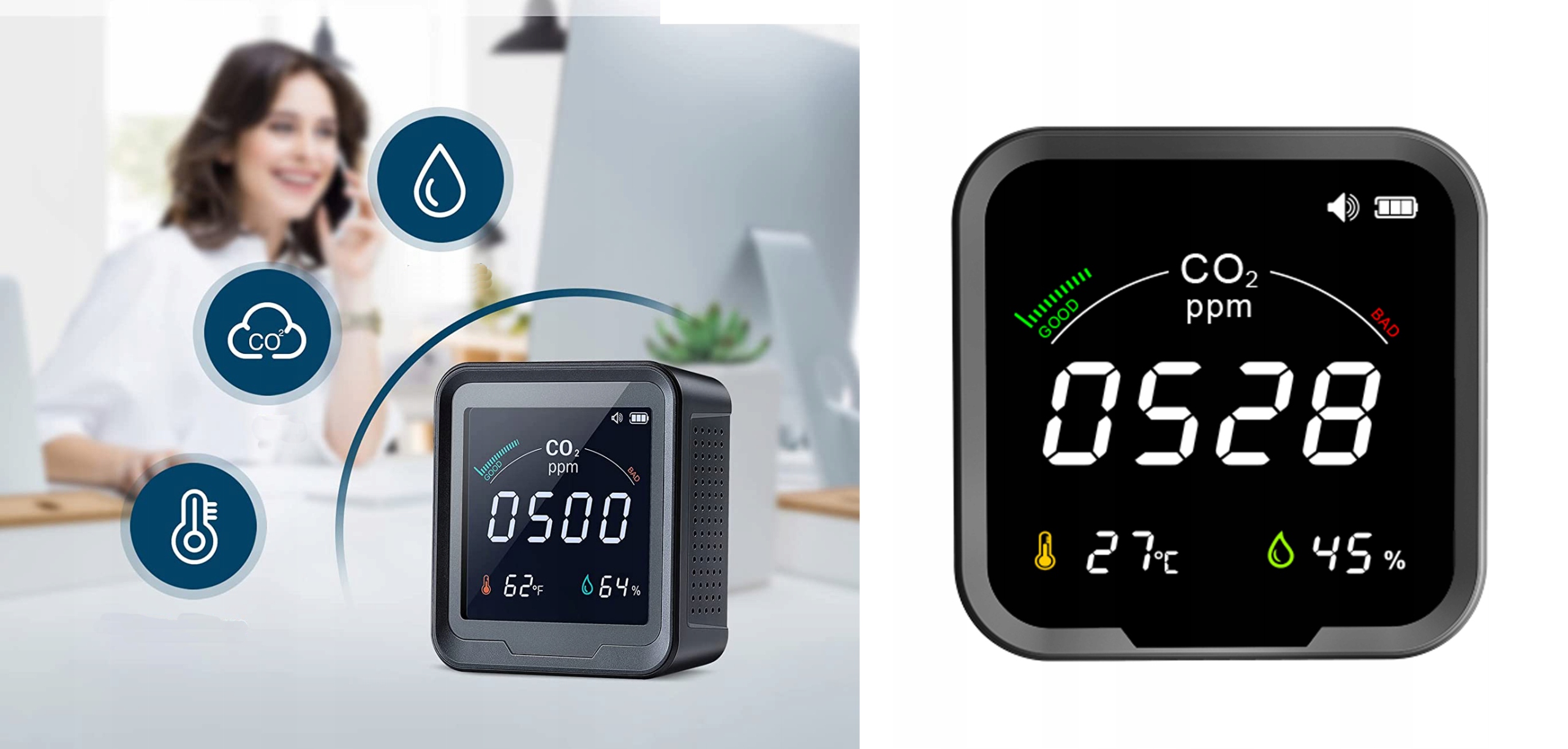 У новій моделі виробник додав функцію ввімкнення/вимкнення звукової сигналізації при перевищенні встановленого порогу СО2 і функція калібрування датчика CO2.