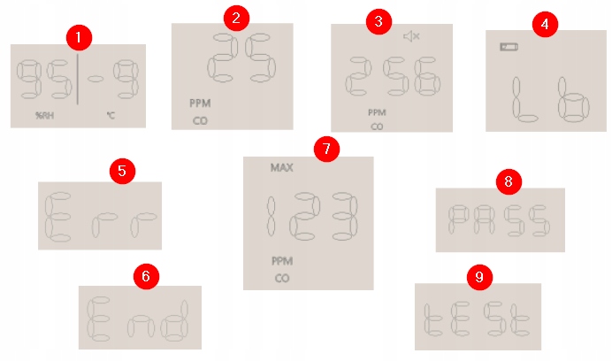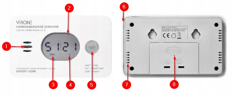 Кнопка дозволяє перевірити правильну роботу датчика. При натисканні він генерує серію коротких звуків і блимає світлодіод. На РК-дисплеї також відображатиметься інформація про останню найвищу зареєстровану концентрацію сигналу CO, що підтверджує ефективність пристрою.